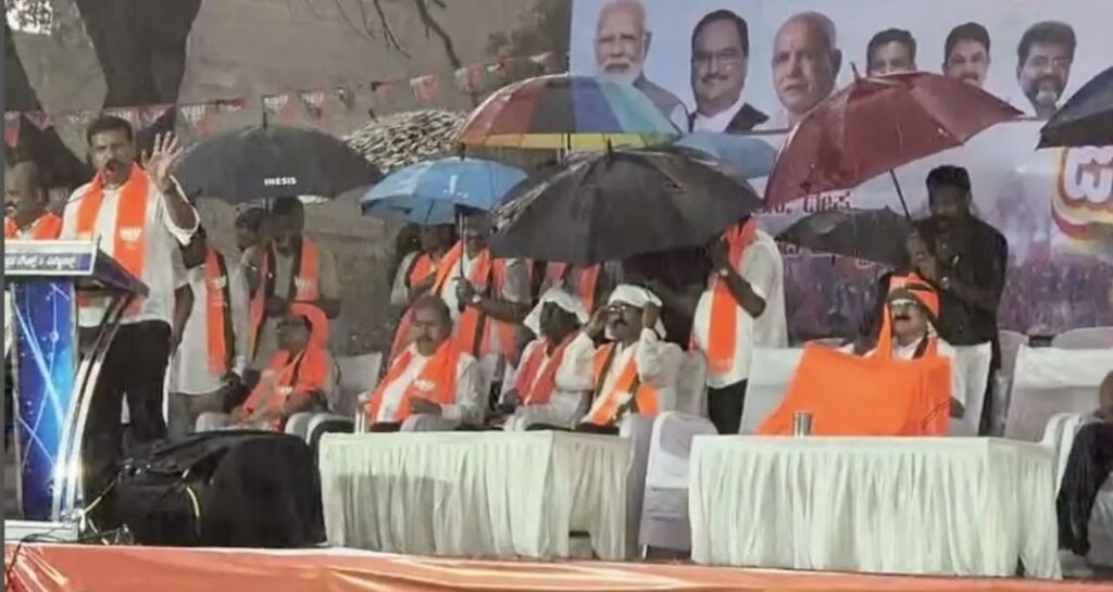 ಶಿವಮೊಗ್ಗ ನಗರ ಶಾಸಕ ಎಸ್.ಎನ್.ಚನ್ನಬಸಪ್ಪ ಮಾತು ಆರಂಭಿಸುತ್ತಿದ್ದಂತೆಯೇ ನಿಧಾನವಾಗಿ ಮಳೆ ಆರಂಭವಾಯಿತು. ಬಿಜೆಪಿ ರಾಜ್ಯ ಘಟಕದ ಅಧ್ಯಕ್ಷ ಬಿ.ವೈ.ವಿಜಯೇಂದ್ರ ಮಾತಾಡುತ್ತಿದ್ದಂತೆಯೇ ಮಳೆ ಆರ್ಭಟಿಸತೊಡಗಿತು. ಈ ವೇಳೆ ವೇದಿಕೆಯಲ್ಲಿದ್ದ ಚಿತ್ರದುರ್ಗ ಸಂಸದ ಗೋವಿಂದ ಕಾರಜೋಳ, ಶಿವಮೊಗ್ಗ ಸಂಸದ ಬಿ.ವೈ.ರಾಘವೇಂದ್ರ, ಮಾಜಿ ಶಾಸಕರಾದ ಅಶೋಕ ನಾಯ್ಕ, ಎಸ್.ರುದ್ರೇಗೌಡ ಅವರಿಗೆ ಅಂಗರಕ್ಷಕರು ಛತ್ರಿ ಹಿಡಿದು ಮಳೆಯಿಂದ ರಕ್ಷಣೆ ನೀಡಿದರು.