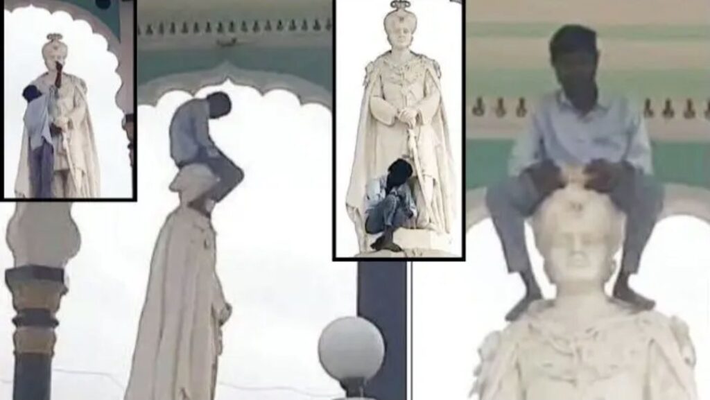 ಶುಕ್ರವಾರ ಸಂಜೆ ಬೆಳಕಿನಲ್ಲಿಯೇ ಈ ಘಟನೆ ನಡೆದಿದೆ. ಪ್ರತಿಮೆಗೆ ಹಾನಿ ಆಗೋದನ್ನೂ ಲೆಕ್ಕಿಸದೇ ಪುಂಡಾಟ ಮೆರೆದಿರುವ ವಿಡಿಯೋ ವೈರಲ್ ಆಗಿದೆ.