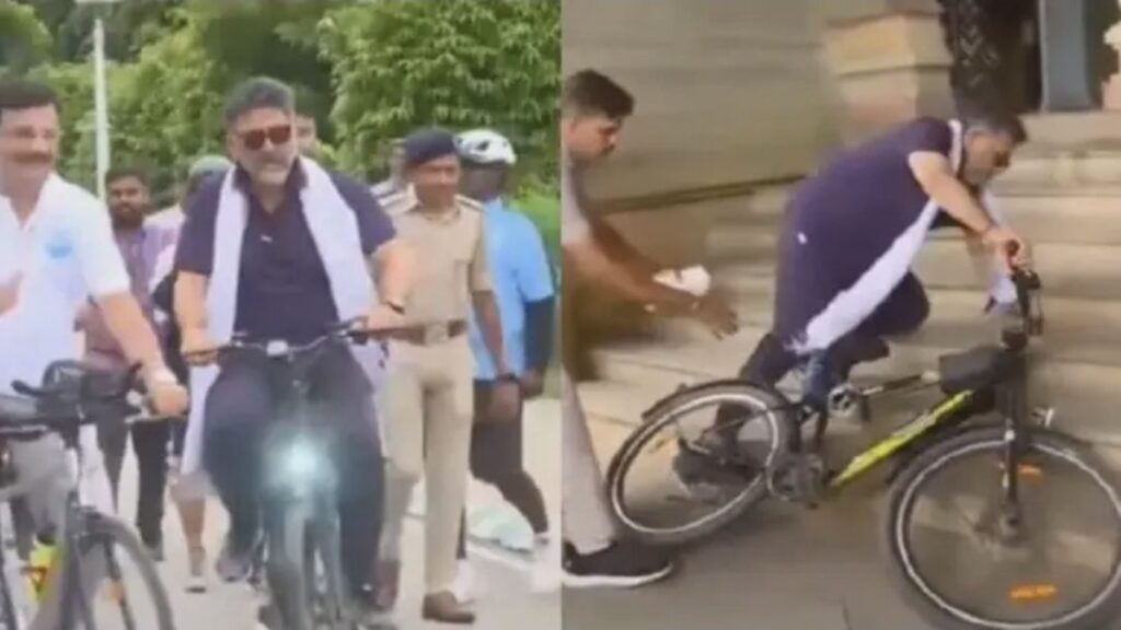 ರಾಜ್ಯ ರಾಜಧಾನಿ ಬೆಂಗಳೂರಿನಲ್ಲಿ ವಿಶ್ವ ಪರಿಸರ ದಿನದ ಅಂಗವಾಗಿ ಇಂದು ಹಮ್ಮಿಕೊಳ್ಳಲಾದ ಸೈಕಲ್ ಜಾಥಾದ ವೇಳೆ ಡಿಸಿಎಂ ಡಿಕೆ ಶಿವಕುಮಾರ್ ಅವರು ಸೈಕಲ್ನಿಂದ ಮುಗ್ಗರಿಸಿ ಬಿದ್ದಿರುವ ಪ್ರಸಂಗ ನಡೆದಿದೆ. ಇದರ ವಿಡಿಯೋ ಸಾಮಾಜಿಕ ಜಾಲತಾಣದಲ್ಲಿ ಹರಿದಾಡುತ್ತಿದೆ.