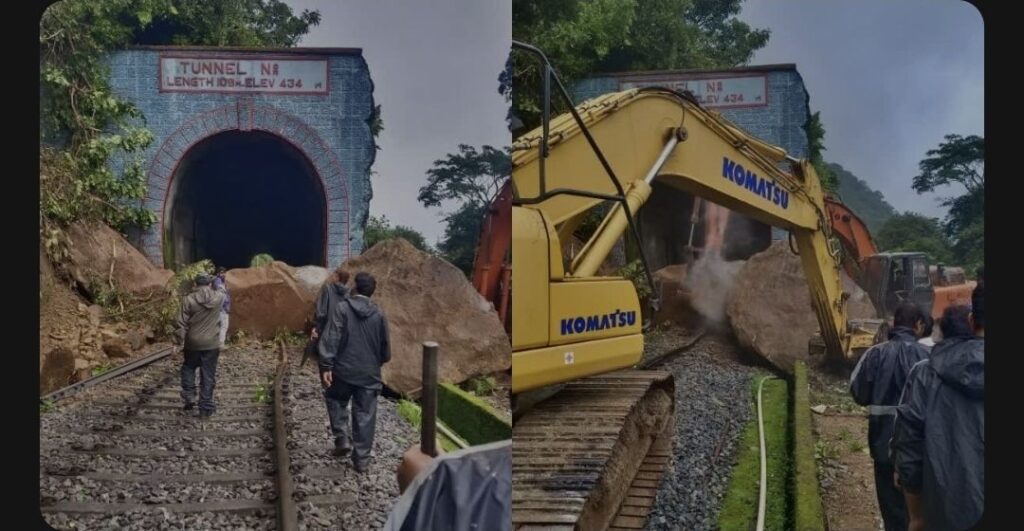 ಸುಬ್ರಹ್ಮಣ್ಯ: ಸಕಲೇಶಪುರದಿಂದ ಸುಬ್ರಹ್ಮಣ್ಯ ರೋಡ್ ರೈಲ್ವೆ ನಿಲ್ದಾಣದ ನಡುವೆ ಬರುವ ಎಡಕುಮಾರಿ-ಶಿರಿಬಾಗಿಲು ನಡುವೆ ಗುಡ್ಡ ಕುಸಿದು ಮೆಟೀರಿಯಲ್ ರೈಲ್ವೆ ಹಳಿ ಮೇಲೆ ಬಂಡೆಗಳು ಬಿದ್ದ ಪರಿಣಾಮ ರೈಲು ಸಂಚಾರದ ಸಮಯದಲ್ಲಿ ವ್ಯತ್ಯಯವಾಗಿದೆ.