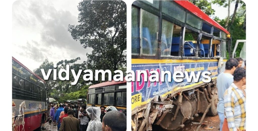 ದಿನಾಂಕ 25.06.2025 ರಂದು ಸಂಜೆ ಸುಳ್ಯ ಪೊಲೀಸ್ ಠಾಣಾ ವ್ಯಾಪ್ತಿಯ ಸುಳ್ಯ ಆರಂತೋಡು ಗ್ರಾಮದ ಕೋಡಂಕೇರಿ ಎಂಬಲ್ಲಿ, ಸುಳ್ಯದಿಂದ ಮಡಿಕೇರಿ ಕಡೆಗೆ ಹೋಗುತ್ತಿದ್ದ KA 21 F 0069 ನೋಂದಣಿ ಸಂಖ್ಯೆಯ ಕೆ.ಎಸ್.ಆರ್.ಟಿ.ಸಿ ಬಸ್ ಗೆ, ಮಡಿಕೇರಿ ಕಡೆಯಿಂದ – ಸುಳ್ಯ ಮಾರ್ಗವಾಗಿ ಬರುತ್ತಿದ್ದ KA 19 F 3620 ನೊಂದಣಿ ಸಂಖ್ಯೆಯ ಕೆ.ಎಸ್.ಆರ್.ಟಿ.ಸಿ ಬಸ್ ಚಾಲಕನ ನಿರ್ಲಕ್ಷ್ಯತನದ ಚಾಲನೆಯಿಂದಾಗಿ ಅಪಘಾತವಾಗಿರುತ್ತದೆ. ಅಪಘಾತದಲ್ಲಿ ಮಡಿಕೇರಿ ಕುಶಾಲನಗರ ಮೂಲದ ಭಾರತಿ (50) ಎಂಬವರು ಸ್ಥಳದಲ್ಲೇ ಮೃತಪಟ್ಟಿದ್ದು, 02 ಪ್ರಯಾಣಿಕರಿಗೆ ಗಂಭೀರ ಗಾಯಗಳಾಗಿರುತ್ತದೆ. ಪ್ರಯಾಣಿಕರ ಪೈಕಿ 17 ಜನರಿಗೆ ಸಾಮಾನ್ಯ ಗಾಯಗಳಾಗಿದ್ದು, ಎಲ್ಲಾ ಗಾಯಾಳುಗಳನ್ನು ಚಿಕಿತ್ಸೆಗಾಗಿ ಬೇರೆ ಬೇರೆ ಆಸ್ಪತ್ರೆಗಳಿಗೆ ದಾಖಲಿಸಲಾಗಿರುತ್ತದೆ. ಘಟನಾ ಸ್ಥಳಕ್ಕೆ ಸುಳ್ಯ ವೃತ್ತ ನಿರೀಕ್ಷಕರು ಹಾಗೂ ಉಪನಿರೀಕ್ಷಕರು ಭೇಟಿ ನೀಡಿದ್ದು, ಸುಳ್ಯ ಪೊಲೀಸ್ ಠಾಣೆಯಲ್ಲಿ ಪ್ರಕರಣ ದಾಖಲಿಸಿಕೊಂಡು ಮುಂದಿನ ಕಾನೂನುಕ್ರಮ ಕೈಗೊಳ್ಳಲಾಗುವುದು. ಅಪಘಾತಕ್ಕೀಡಾದ ವಾಹನಗಳನ್ನು ರಸ್ತೆಯಿಂದ ತೆರವುಗೊಳಿಸಿ ಸುಗಮ ಸಂಚಾರಕ್ಕೆ ಅನುವು ಮಾಡಲಾಗಿರುತ್ತದೆ.