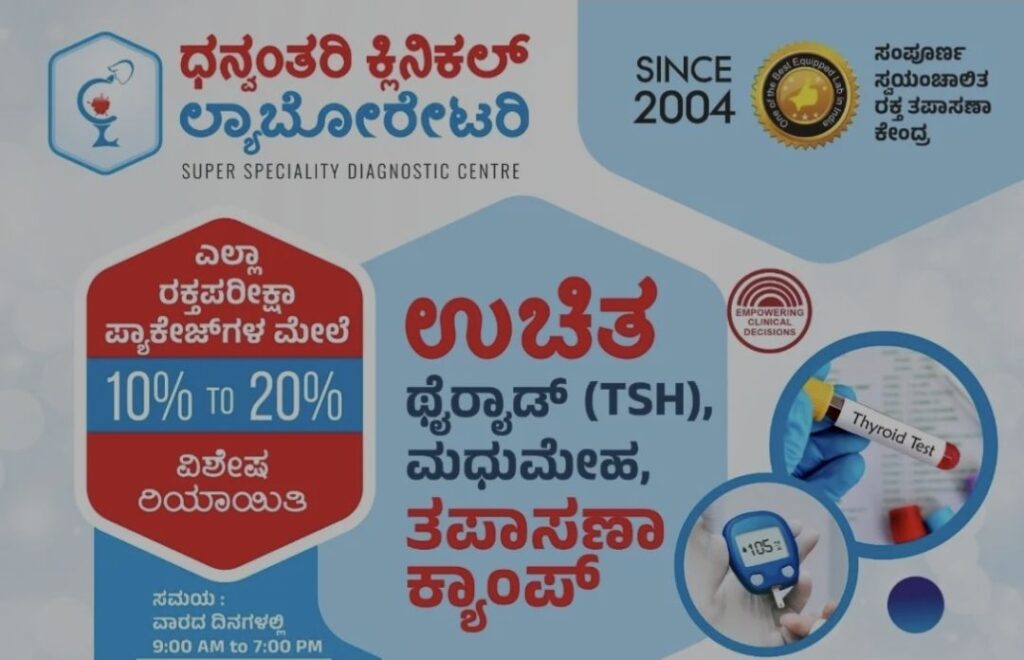 ಪುತ್ತೂರು : ನಗರದ ಪ್ರತಿಷ್ಠಿತ ಧನ್ವಂತರಿ ಕ್ಲಿನಿಕಲ್ ಲ್ಯಾಬೋರೇಟರಿಯು ಸಾರ್ವಜನಿಕರ ಆರೋಗ್ಯದ ಹಿತದೃಷ್ಟಿಯಿಂದ ತನ್ನ ಬೊಳುವಾರು ಶಾಖೆಯಲ್ಲಿ ಜೂನ್ 28 ಮತ್ತು 29 ರಂದು ಎರಡು ದಿನಗಳ ಕಾಲ ಉಚಿತ ಥೈರಾಯಿಡ್ (TSH) ಹಾಗೂ ಮಧುಮೇಹ (ಶುಗರ್) ತಪಾಸಣಾ ಶಿಬಿರವನ್ನು ಆಯೋಜಿಸಿದೆ.
