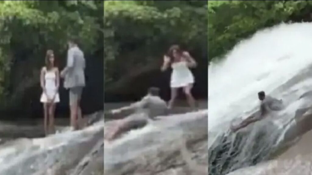 ಯುವತಿಯು ಅದರಂತೆ ಜಲಪಾತದ ಅಂಚಿನಲ್ಲಿ ನಿಂತು ಸುತ್ತಲೂ ನೋಡುತ್ತಿರುವಾಗ ವ್ಯಕ್ತಿಯು ಆಕೆಯನ್ನು ಕರೆದು ಜೇಬಿನಿಂದ ಉಂಗುರವನ್ನು ತೆಗೆದು ಬಂಡೆಯ ಮೇಲೆಯೇ ಮೊಣಕಾಲು ಊರಿ ಪ್ರಪೋಸ್ ಮಾಡಲು ಮುಂದಾದಾಗ ಏಕಾಏಕಿ ಬಂಡೆ ಜಾರಿದೆ.