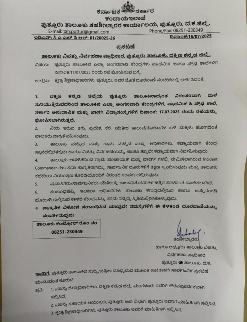 ಪ್ರಾಕೃತಿಕ ವಿಕೋಪ ಹಾಗೂ ತುರ್ತು ಪರಿಸ್ಥಿತಿಗಳ ಸಂಬಂಧ ಯಾವುದೇ ಮಾಹಿತಿ ಅಥವಾ ಸಹಾಯಕ್ಕಾಗಿ ಪುತ್ತೂರು ತಾಲೂಕು ಕಛೇರಿಯ ಈ ದೂರವಾಣಿ ಸಂಖ್ಯೆಗೆ ಸಂಪರ್ಕಿಸಬಹುದು: 08251-230349