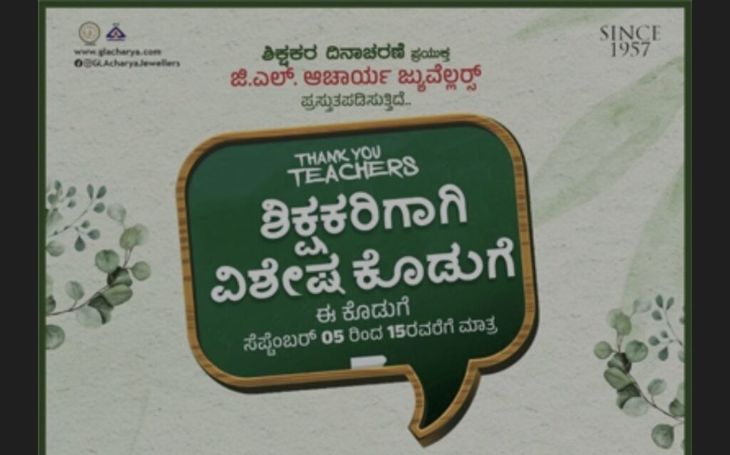 ಪುತ್ತೂರು:ಮುಖ್ಯ ರಸ್ತೆಯಲ್ಲಿ ಕಾರ್ಯನಿರ್ವಹಿಸುತ್ತಿರುವ ಪ್ರತಿಷ್ಠಿತ ಜಿಎಲ್ ಆಚಾರ್ಯ ಜ್ಯುವೆಲ್ಲರ್ಸ್ ಶಿಕ್ಷಕರ ದಿನಾಚರಣೆಯ ಅಂಗವಾಗಿ ಶಿಕ್ಷಕರಿಗಾಗಿ ಆಕರ್ಷಕ ಕೊಡುಗೆಯನ್ನು ಘೋಷಿಸಿದೆ.
