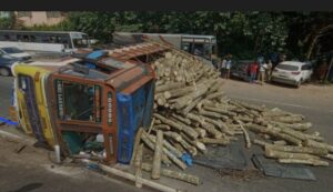 ಮಂಗಳೂರು: ಮರದ ದಿಮ್ಮಿಗಳನ್ನು ಸಾಗಿಸುತ್ತಿದ್ದ ಲಾರಿಯೊಂದು ರಸ್ತೆಯಲ್ಲೇ ಪಲ್ಟಿಯಾದ ಘಟನೆ ರಾಷ್ಟ್ರೀಯ ಹೆದ್ದಾರಿ 66ರ ಎಕ್ಕೂರಿನಲ್ಲಿ ಶನಿವಾರ ಮಧ್ಯಾಹ್ನ ನಡೆದಿದೆ.
