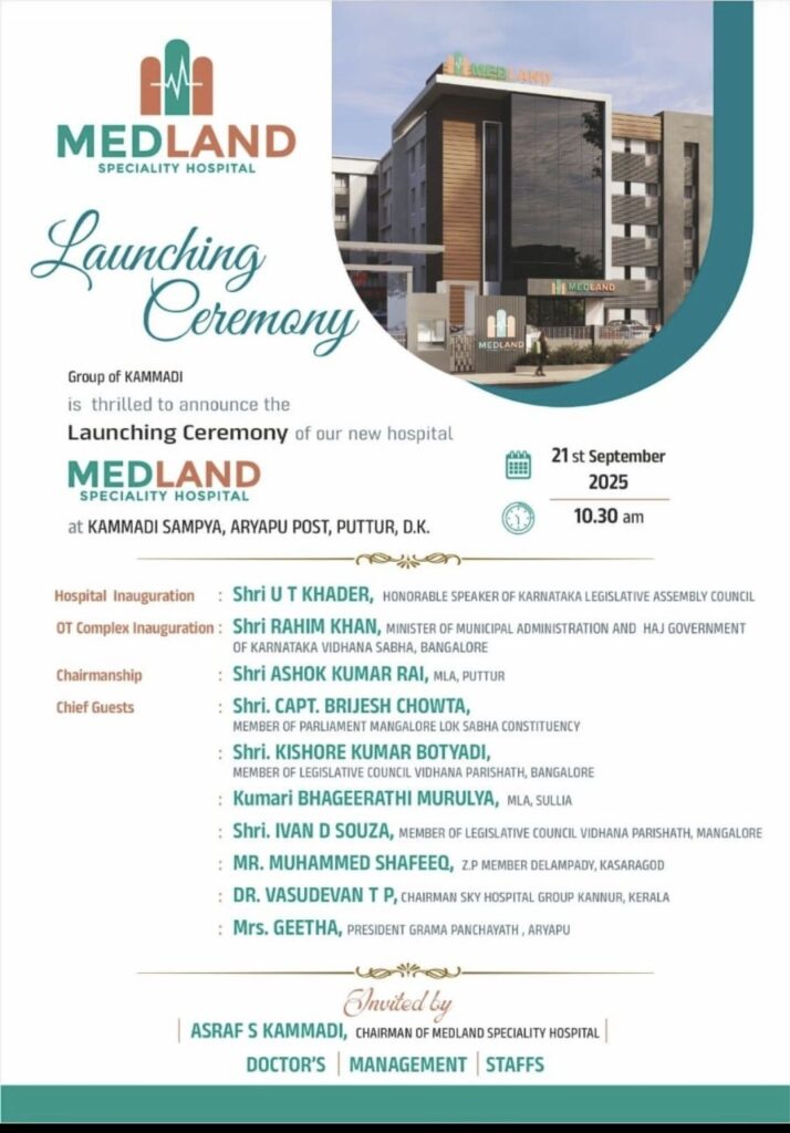 ಪುತ್ತೂರು: ಮಾಣಿ–ಮೈಸೂರು ರಾಷ್ಟ್ರೀಯ ಹೆದ್ದಾರಿಯ ಪುತ್ತೂರು ಸಮೀಪದ ಸಂಪ್ಯದಲ್ಲಿ ನಿರ್ಮಿತಗೊಂಡಿರುವ ಅತ್ಯಾಧುನಿಕ ಮೆಡ್ ಲ್ಯಾಂಡ್ ಸ್ಪೆಷಾಲಿಟಿ ಆಸ್ಪತ್ರೆಯ ಲೋಕಾರ್ಪಣಾ ಸಮಾರಂಭ ಸೆ.21ರಂದು ಬೆಳಿಗ್ಗೆ 10.30ಕ್ಕೆ ನಡೆಯಲಿದೆ. ಕಾರ್ಯಕ್ರಮವನ್ನು ಕರ್ನಾಟಕ ವಿಧಾನಸಭೆಯ ಸ್ಪೀಕರ್ ಯು.ಟಿ. ಖಾದರ್ ಉದ್ಘಾಟಿಸಲಿದ್ದಾರೆ ಮತ್ತು ಆಸ್ಪತ್ರೆಯ ಓ.ಟಿ (ಶಸ್ತ್ರಚಿಕಿತ್ಸಾ) ವಿಭಾಗವನ್ನು ರಾಜ್ಯ ಪೌರಾಡಳಿತ ಮತ್ತು ಹಜ್ ಸಚಿವ ರಹೀಂ ಖಾನ್ ಉದ್ಘಾಟಿಸಲಿದ್ದಾರೆ. ಪುತ್ತೂರು ಶಾಸಕ ಅಶೋಕ್ ಕುಮಾರ್ ರೈ ಕಾರ್ಯಕ್ರಮದ ಅಧ್ಯಕ್ಷರಾಗಿರುವರು.