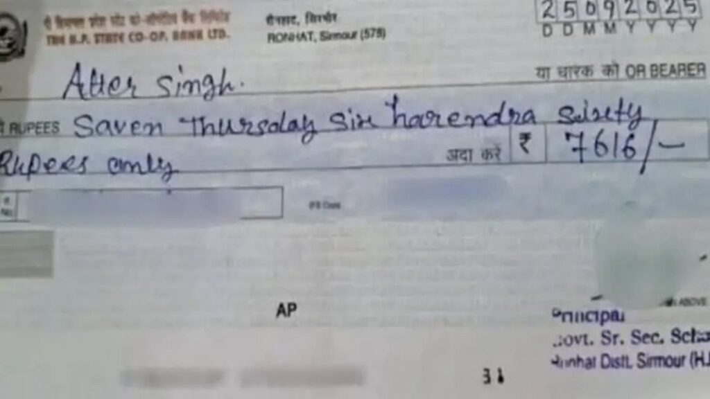 ರೋಹ್ನಾಟ್ ಸರ್ಕಾರಿ ಹಿರಿಯ ಮಾಧ್ಯಮಿಕ ಶಾಲೆಯ ಚಿತ್ರಕಲಾ ಶಿಕ್ಷಕ ಅಟ್ಟರ್ ಸಿಂಗ್ ಅವರು ಸೆಪ್ಟೆಂಬರ್ 25ರಂದು ನೀಡಿದ ₹7,616ರ ಚೆಕ್ನಲ್ಲಿ “Saven Thursday Six Harendra Sixtey” ಎಂದು ತಪ್ಪಾಗಿ ಬರೆದು ಸಾರ್ವಜನಿಕರ ಅಪಹಾಸ್ಯಕ್ಕೆ ಗುರಿಯಾಗಿದ್ದರು.
