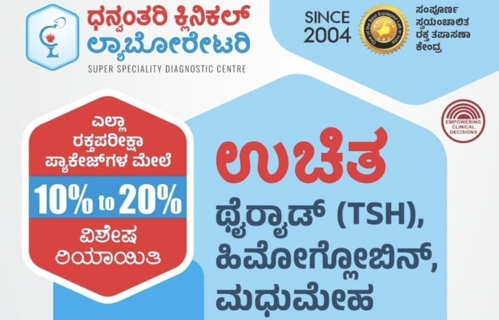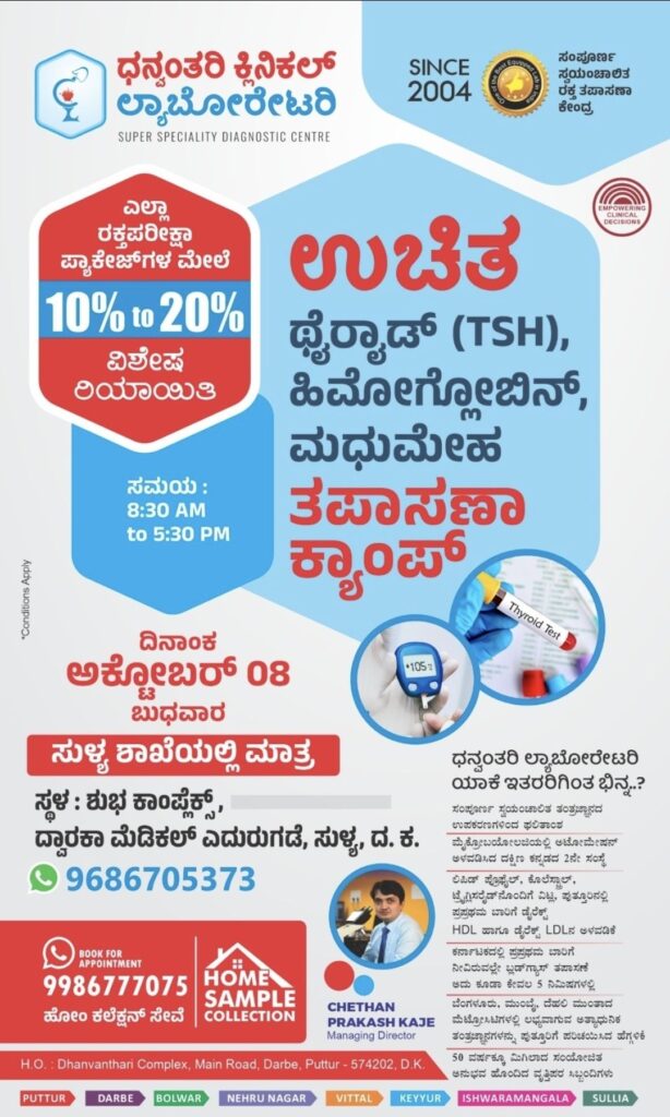 ಪುತ್ತೂರು: ನಗರದ ಪ್ರತಿಷ್ಠಿತ ಆರೋಗ್ಯ ಸೇವಾ ಸಂಸ್ಥೆಯಾದ ಧನ್ವಂತರಿ ಕ್ಲಿನಿಕಲ್ ಲ್ಯಾಬೋರೇಟರಿ ಸುಳ್ಯ ಶಾಖೆಯಲ್ಲಿ ಅಕ್ಟೋಬರ್ 08ರಂದು ಒಂದು ದಿನ ಉಚಿತ ಥೈರಾಯಿಡ್ (TSH) ಮತ್ತು ಮಧುಮೇಹ (ಶುಗರ್) ತಪಾಸಣಾ ಶಿಬಿರವನ್ನು ಆಯೋಜಿಸಲಾಗಿದೆ.