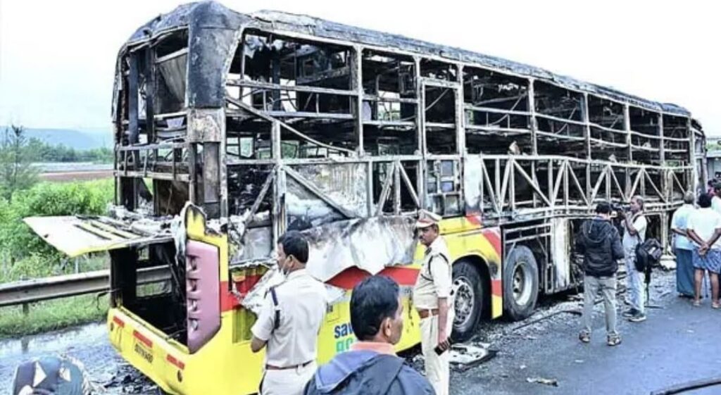 43 ಜನರನ್ನು ಹೊತ್ತಿದ್ದ ದಿಯು-ದಮನ್ ನೋಂದಾಯಿತ ವೆಮೂರಿ ಕಾವೇರಿ ಟ್ರಾವೆಲ್ಸ್ ಸ್ಲೀಪರ್ ಬಸ್ ಗುರುವಾರ ಬೆಳಗಿನ ಜಾವ 2:30ರ ಸುಮಾರಿಗೆ ಕರ್ನೂಲ್ ಬಳಿ ಸಾಗಿಬರುತ್ತಿತ್ತು. ಈ ವೇಳೆ ದ್ವಿಚಕ್ರ ವಾಹನವೊಂದು ಡಿಕ್ಕಿ ಹೊಡೆದಿದೆ. ಪರಿಣಾಮ 400 ಮೀ. ದೂರದವರೆಗೂ ಬೈಕ್ ಅನ್ನು ಬಸ್ ತಳ್ಳಿಕೊಂಡು ಹೋಗಿದೆ. ಈ ವೇಳೆ ಬೈಕ್ನ ಪೆಟ್ರೋಲ್ ಟ್ಯಾಂಕ್ನಿಂದ ಇಂಧನ ಸೋರಿಕೆಯಾಗಿ ಬಸ್ಗೆ ಬೆಂಕಿ ಹೊತ್ತಿಕೊಂಡಿದೆ. ವೈರ್ ತುಂಡಾಗಿ ಶಾರ್ಟ್ ಸರ್ಕೀಟ್ ಉಂಟಾದ ಕಾರಣ ಬಸ್ನ ಬಾಗಿಲು ಲಾಕ್ ಆಗಿದೆ. ಕೆಲವೇ ಕ್ಷಣಗಳಲ್ಲಿ ಧಗಧಗಿಸಿದ ಬೆಂಕಿಯಿಂದ ಎಚ್ಚರಗೊಂಡ ಪ್ರಯಾಣಿಕರು ಬಾಗಿಲು ತೆರೆಯಲು ಪ್ರಯತ್ನಿಸಿದರೂ ತೆರೆಯದ ಕಾರಣ ತುರ್ತುನಿರ್ಗಮನ ದ್ವಾರ ಮತ್ತು ಕಿಟಕಿ ಗಾಜುಗಳನ್ನು ಒಡೆದು ಹೊರಜಿಗಿದಿದ್ದಾರೆ. 19 ಪ್ರಯಾಣಿಕರು ಮಾತ್ರ ಹೊರಬರಲಾರದೆ ಬಸ್ನಲ್ಲಿಯೇ ಕರಕಲಾಗಿ ದಾರುಣ ಅಂತ್ಯ ಕಂಡಿದ್ದಾರೆ. ಬೈಕರ್ ಕೂಡ ಮೃತಪಟ್ಟಿದ್ದಾನೆ