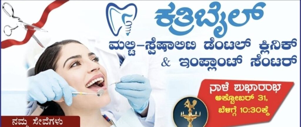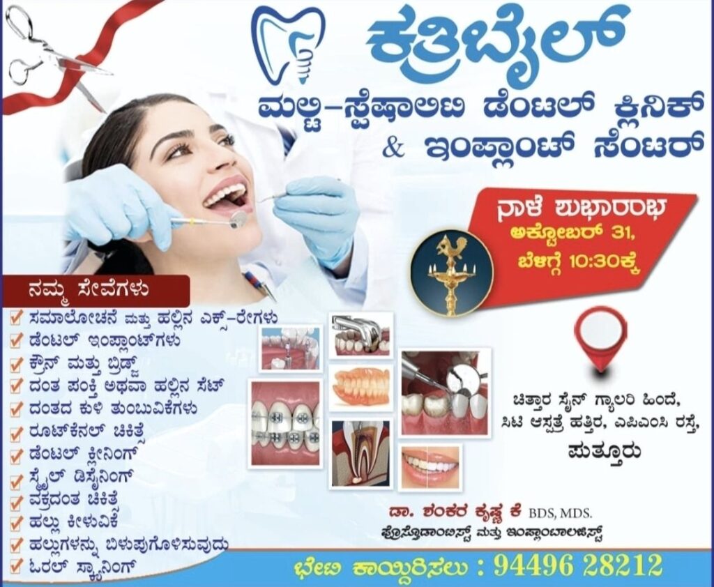 ಪುತ್ತೂರು: ನಗರದ ಎಪಿಎಂಸಿ ರಸ್ತೆಯಲ್ಲಿರುವ ಸಿಟಿ ಆಸ್ಪತ್ರೆ ಹತ್ತಿರ, ಚಿತ್ತಾರ ಸೈನ್ ಗ್ಯಾಲರಿ ಹಿಂದೆ ನೂತನವಾಗಿ ನಿರ್ಮಿತ “ಕತ್ರಿಬೈಲ್ ಮಲ್ಟಿ-ಸ್ಪೆಷಾಲಿಟಿ ಡೆಂಟಲ್ ಕ್ಲಿನಿಕ್ & ಇಂಪ್ಲಾಂಟ್ ಸೆಂಟರ್” ನಾಳೆ (ಅ.31) ಬೆಳಗ್ಗೆ 10.30ಕ್ಕೆ ಶುಭಾರಂಭವಾಗಲಿದೆ.