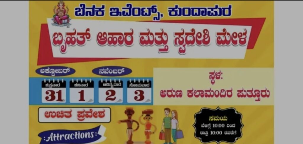 ಪುತ್ತೂರು : ಪುತ್ತೂರಿನ ಅರುಣ ಕಲಾಮಂದಿರದಲ್ಲಿ ಕುಂದಾಪುರದ ಬೆನಕ ಇವೆಂಟ್ಸ್ ನ ಆಶ್ರಯದಲ್ಲಿ ಬೃಹತ್ ಆಹಾರ ಮತ್ತು ಸ್ವದೇಶಿ ಮೇಳ ಕಾರ್ಯಕ್ರಮವು ಅ.31ರಿಂದ ನ.03ರವರೆಗೆ ನಡೆಯಲಿದೆ.