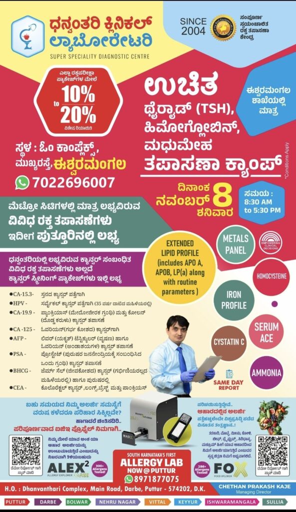 ಪುತ್ತೂರು: ನಗರದ ಪ್ರತಿಷ್ಠಿತ ಆರೋಗ್ಯ ಸೇವಾ ಸಂಸ್ಥೆಯಾದ ಧನ್ವಂತರಿ ಕ್ಲಿನಿಕಲ್ ಲ್ಯಾಬೋರೇಟರಿ ಈಶ್ವರಮಂಗಲ ಶಾಖೆಯಲ್ಲಿ ನ. 08ರಂದು ಒಂದು ದಿನ ಉಚಿತ ಥೈರಾಯಿಡ್ (TSH) ಮತ್ತು ಮಧುಮೇಹ (ಶುಗರ್) ತಪಾಸಣಾ ಶಿಬಿರವನ್ನು ಆಯೋಜಿಸಲಾಗಿದೆ.