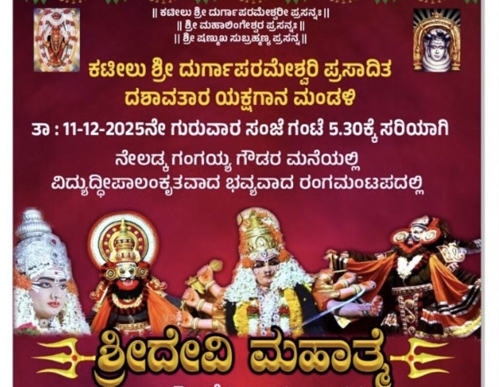 ಪುತ್ತೂರು, ಡಿ.10— ಪುತ್ತೂರು ತಾಲೂಕಿನ ಬೆಳ್ಳಿಪಾಡಿ ನೇಲಡ್ಕದಲ್ಲಿರುವ ಗಂಗಯ್ಯ ಗೌಡರ ಮನೆಯಲ್ಲಿ ಡಿ.11 ರಂದು ಕಟೀಲು ಈ ದುರ್ಗಾಪರಮೇಶ್ವರಿ ಪ್ರಸಾದಿತ ದಶಾವತಾರ ಯಕ್ಷಗಾನ ಮಂಡಳಿ ವತಿಯಿಂದ ‘ಕಟೀಲು ಶ್ರೀದೇವಿ ಮಹಾತ್ಮ’ ಯಕ್ಷಗಾನ ಬಯಲಾಟ ನಡೆಯಲಿದೆ.