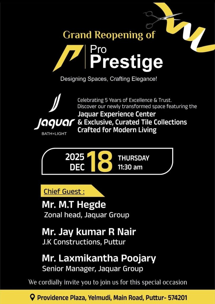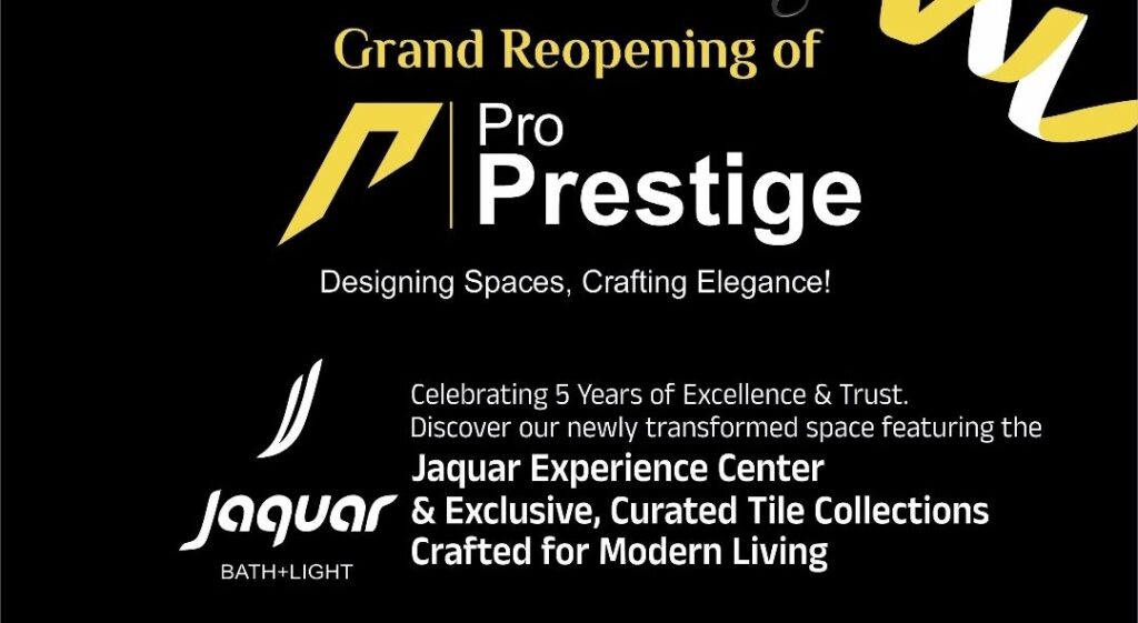 ಯೆಳ್ಮುಡಿ ಮುಖ್ಯರಸ್ತೆಯಲ್ಲಿರುವ ಪ್ರೊವಿಡೆನ್ಸ್ ಪ್ಲಾಜಾ ಸಂಕೀರ್ಣದಲ್ಲಿ ಕಳೆದ ಐದು ವರ್ಷಗಳಿಂದ ಯಶಸ್ವಿಯಾಗಿ ವ್ಯವಹರಿಸುತ್ತಿರುವ ಪ್ರೊ ಪ್ರೆಸ್ಟೀಜ್, ‘Designing Spaces, Crafting Elegance’ ಘೋಷವಾಕ್ಯದೊಂದಿಗೆ ಗ್ರ್ಯಾಂಡ್ ರೀ-ಓಪನಿಂಗ್ಗೆ ಸಜ್ಜಾಗಿದೆ. ಐದು ವರ್ಷಗಳ ಸಾಧನೆ ಮತ್ತು ಗ್ರಾಹಕರ ವಿಶ್ವಾಸವನ್ನು ಸಂಭ್ರಮಿಸುವ ಈ ಕಾರ್ಯಕ್ರಮದಲ್ಲಿ ನವೀಕರಿಸಲಾದ ಮಳಿಗೆ, Jaquar Experience Center ಹಾಗೂ ವಿಶೇಷವಾಗಿ ಆಯ್ದ ಟೈಲ್ ಸಂಗ್ರಹಗಳನ್ನು ಪರಿಚಯಿಸಲಾಗುತ್ತದೆ.