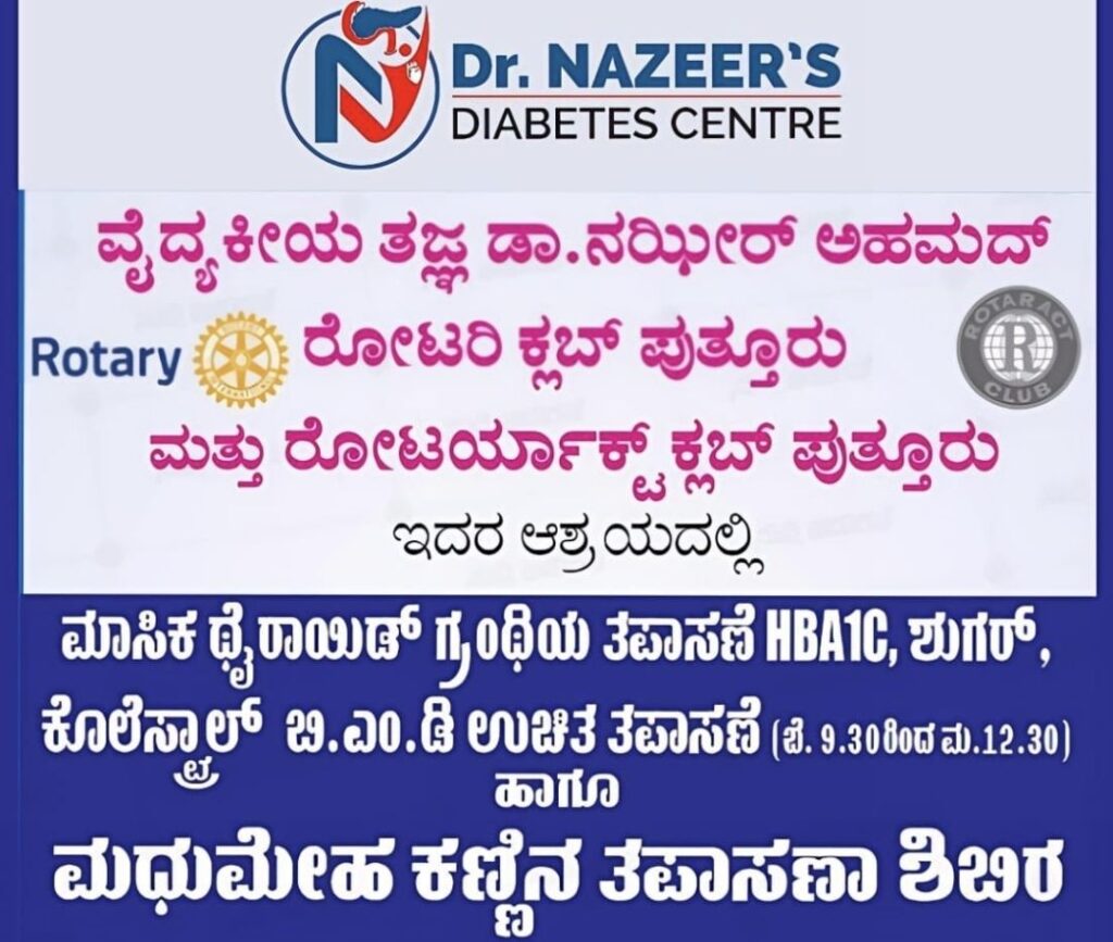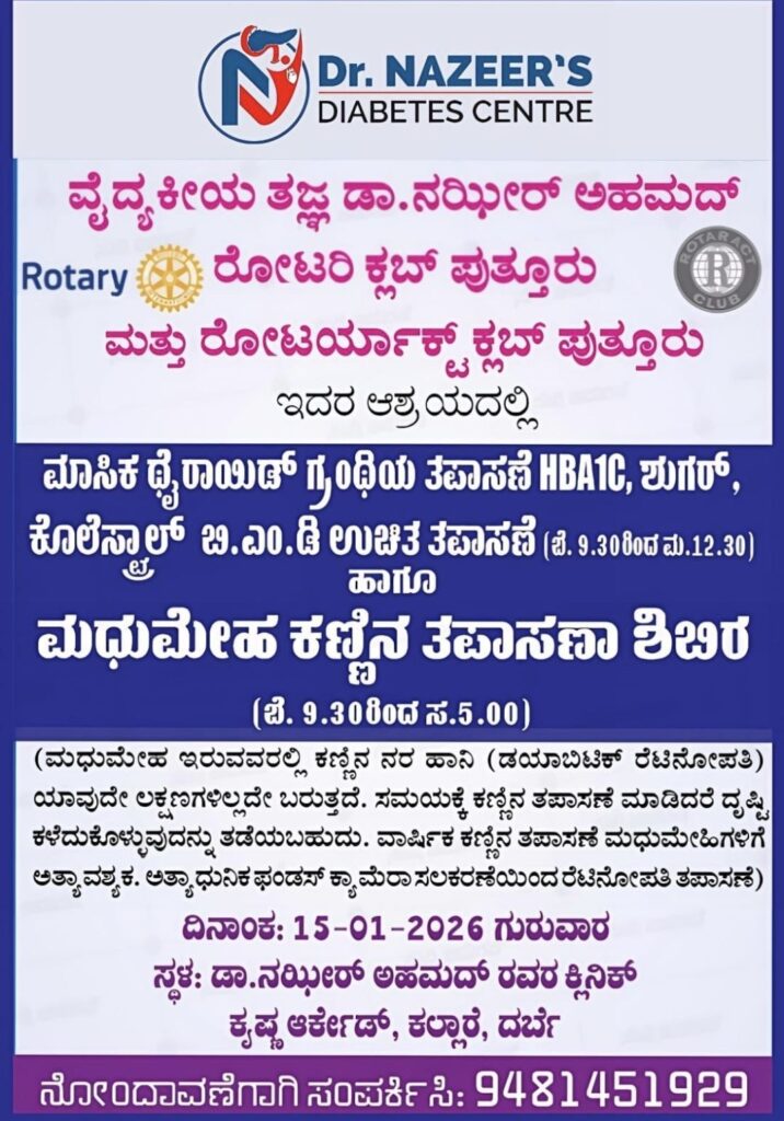 ಪುತ್ತೂರು: ವೈದ್ಯಕೀಯ ತಜ್ಞ ಡಾ. ನಝೀರ್ ಅಹಮದ್ ಅವರ ಡಯಾಬಿಟಿಸ್ ಸೆಂಟರ್, ರೋಟರಿ ಕ್ಲಬ್ ಪುತ್ತೂರು ಹಾಗೂ ರೋಟರ್ಯಾಕ್ಟ್ ಕ್ಲಬ್ ಪುತ್ತೂರು ಇವರ ಆಶ್ರಯದಲ್ಲಿ ಮಾಸಿಕ ಥೈರಾಯಿಡ್ ಗ್ರಂಥಿ ತಪಾಸಣೆ, HbA1C, ಶುಗರ್, ಕೊಲೆಸ್ಟ್ರಾಲ್ ಹಾಗೂ ಬಿ.ಎಂ.ಡಿ (ಬೋನ್ ಮಿನರಲ್ ಡೆನ್ಸಿಟಿ) ಉಚಿತ ತಪಾಸಣಾ ಶಿಬಿರವು ಜ.15 ರಂದು ಕಲ್ಲಾರೆ ಕೃಷ್ಣ ಆರ್ಕೆಡ್ನಲ್ಲಿರುವ ಡಾ. ನಝೀರ್ ಅಹಮದ್ ಅವರ ಕ್ಲಿನಿಕ್ನಲ್ಲಿ ಬೆಳಿಗ್ಗೆಯಿಂದ ಮಧ್ಯಾಹ್ನದವರೆಗೆ ನಡೆಯಲಿದೆ.