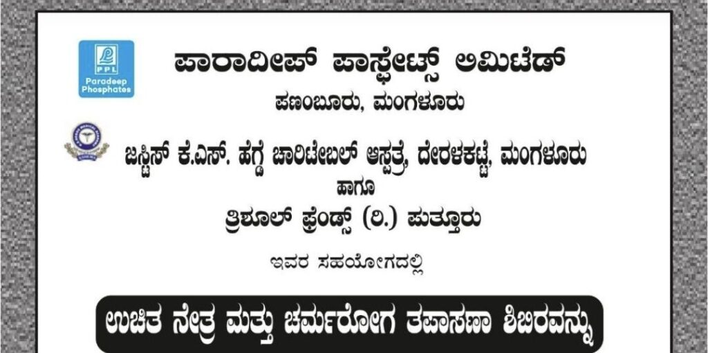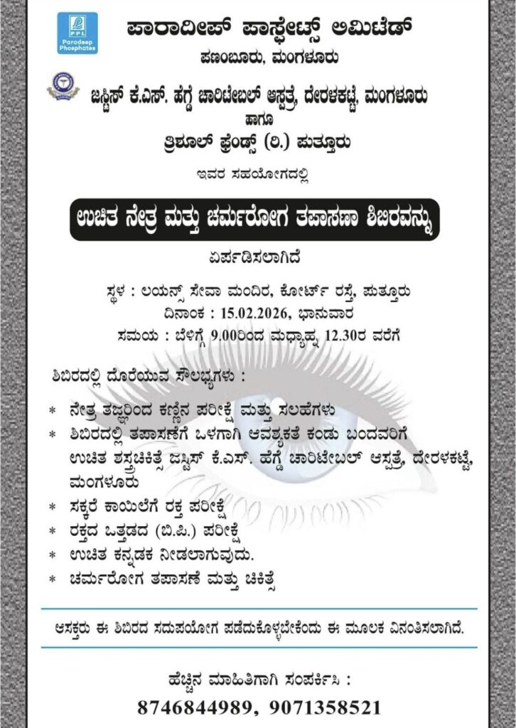 ಪುತ್ತೂರು: ಪಾರಾದೀಪ್ ಪಾಸ್ಟೇಟ್ಸ್ ಲಿಮಿಟೆಡ್, ಪಣಂಬೂರು–ಮಂಗಳೂರು, ಜಸ್ಟಿಸ್ ಕೆ.ಎಸ್. ಹೆಗ್ಡೆ ಚಾರಿಟೇಬಲ್ ಆಸ್ಪತ್ರೆ, ದೇರಳಕಟ್ಟೆ–ಮಂಗಳೂರು ಹಾಗೂ ತ್ರಿಶೂಲ್ ಫ್ರೆಂಡ್ಸ್ (ರಿ.) ಪುತ್ತೂರು ಇವರ ಸಂಯುಕ್ತ ಆಶ್ರಯದಲ್ಲಿ ಉಚಿತ ನೇತ್ರ ಮತ್ತು ಚರ್ಮರೋಗ ತಪಾಸಣಾ ಶಿಬಿರವನ್ನು ಆಯೋಜಿಸಲಾಗಿದೆ.