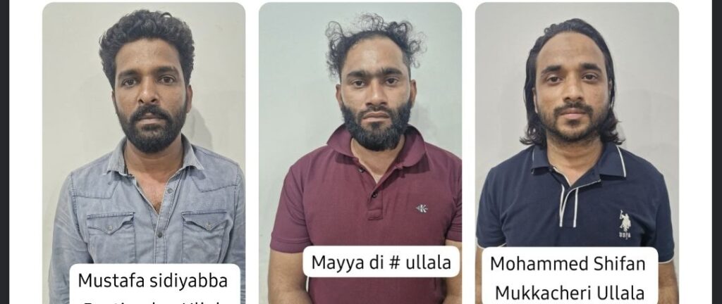 ಬಂಧಿತರನ್ನು ಮುಸ್ತಫಾ ಸೀದಿಯಬ್ಬ (34), ಮೈಯದ್ದಿ (28) ಮತ್ತು ಮೊಹಮ್ಮದ್ ಶಿಫಾನ್ (28) ಎಂದು ಗುರುತಿಸಲಾಗಿದೆ. ಇವರು ಉಳ್ಳಾಲ ಪ್ರದೇಶದ ನಿವಾಸಿಗಳಾಗಿದ್ದಾರೆ.