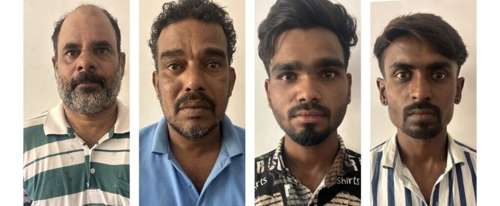 ಬಂಧಿತರನ್ನು ಕರಣ್ ಬಾಬು ರಾಂ ಜಾದವ್ (27), ಸಮತಾ ನಗರ, ಚೊಪ್ಪಡ ತಾಲೂಕು, ಜಲಗಾಂ ಜಿಲ್ಲೆ, ಮಹಾರಾಷ್ಟ್ರ; ಸಮೀರ್ ಶಾ (19), ದೇವಾಸ್ ಜಿಲ್ಲೆ, ಮಧ್ಯಪ್ರದೇಶ; ಎಂ.ಹೆಚ್. ಮಯ್ಯದಿ (48), ಹೆಜಮಾಡಿ ಕೋಡಿ, ಉಡುಪಿ ಜಿಲ್ಲೆ; ಹಾಗೂ ಇಬ್ರಾಹಿಂ ಕಲೀಲ್ (47), ಕುದ್ರೋಳಿ, ಮಂಗಳೂರು (ಪ್ರಸ್ತುತ ಕಾವೂರು ನಿವಾಸಿ) ಎಂದು ಗುರುತಿಸಲಾಗಿದೆ.
