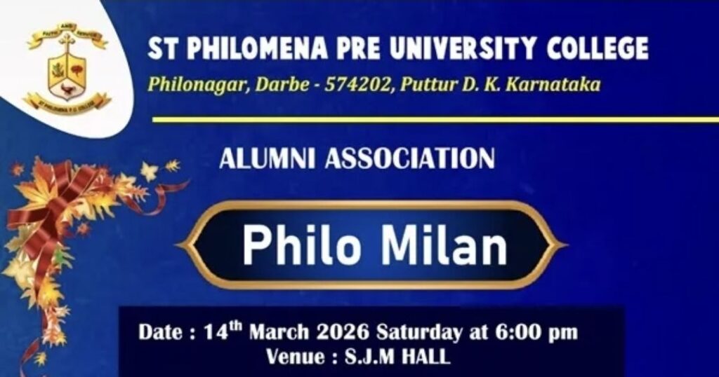 ಪುತ್ತೂರು, ಮಾ.11: ಸಂತ ಫಿಲೋಮಿನಾ ಪದವಿ ಪೂರ್ವ ಕಾಲೇಜಿನ ಹಿರಿಯ ವಿದ್ಯಾರ್ಥಿಗಳ ಸಮಾಗಮ ‘ಫಿಲೋ ಮಿಲನ – 2026’ ಕಾರ್ಯಕ್ರಮವು ಮಾರ್ಚ್ 14ರಂದು ಕಾಲೇಜಿನ ಪ್ರಾಂಗಣದಲ್ಲಿ ನಡೆಯಲಿದೆ.