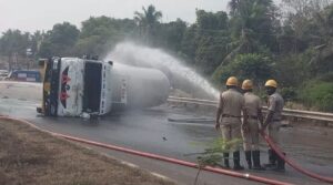 ಕಾಪು ತಾಲೂಕಿನ ಕಟಪಾಡಿಯಲ್ಲಿ ಕಾಮಗಾರಿ ನಡೆಯುತ್ತಿರುವ ಹೆದ್ದಾರಿಯಲ್ಲಿ ಸಾಗುತ್ತಿದ್ದ ಗ್ಯಾಸ್ ಟ್ಯಾಂಕರ್ ಏಕಾಏಕಿ ಚಾಲಕನ ನಿಯಂತ್ರಣ ತಪ್ಪಿ ಮಗುಚಿ ಬಿದ್ದಿದೆ. ಸ್ಥಳದಲ್ಲಿ ಕೆಲಕಾಲ ಆತಂಕದ ವಾತಾವರಣ ನಿರ್ಮಾಣವಾಯಿತು. ಘಟನೆ ಕುರಿತು ಮಾಹಿತಿ ತಿಳಿದ ಕೂಡಲೇ ಅಗ್ನಿಶಾಮಕ ದಳದ ಸಿಬ್ಬಂದಿ ಸ್ಥಳಕ್ಕೆ ಧಾವಿಸಿ ಟ್ಯಾಂಕರ್ನಲ್ಲಿ ಗ್ಯಾಸ್ ಸೋರಿಕೆ ಆಗಿದೆಯೇ ಎಂಬುದನ್ನು ಅಧಿಕಾರಿಗಳು ಪರಿಶೀಲಿಸಿದ್ದಾರೆ.