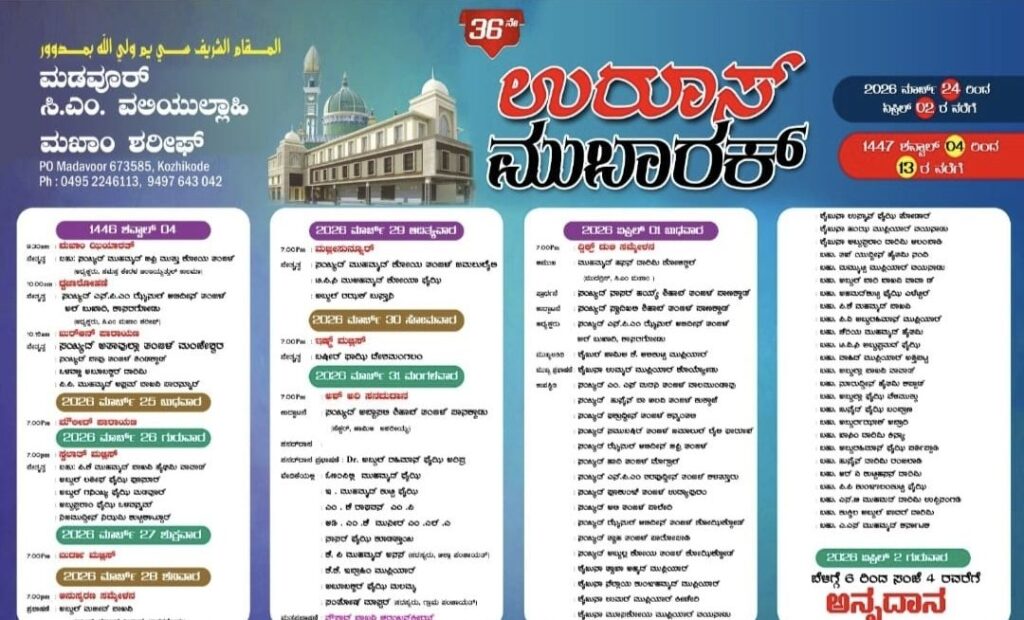 ಕಲ್ಲಿಕೋಟೆ: ಕಾಲಘಟ್ಟದ ಪವಾಡ ಪುರುಷ, ಲಕ್ಷಾಂತರ ಭಕ್ತರ ಆರಾಧ್ಯರಾದ ಶೈಖ್ ಖುತುಬುಝ್ಝಮಾನ್ ಸಿ.ಎಂ ಅಬೂಬಕರ್ ಮುಸ್ಲಿಯಾರ್ (ಖ.ಸಿ) ಮಡವೂರು ಅವರ ಮಖಾಂ ಶರೀಫ್ನಲ್ಲಿ 36ನೇ ಉರೂಸ್ ಮುಬಾರಕ್ 2026ರ ಮಾರ್ಚ್ 24ರಿಂದ ಏಪ್ರಿಲ್ 2ರವರೆಗೆ ವಿಜೃಂಭಣೆಯಿಂದ ನಡೆಯಲಿದೆ.