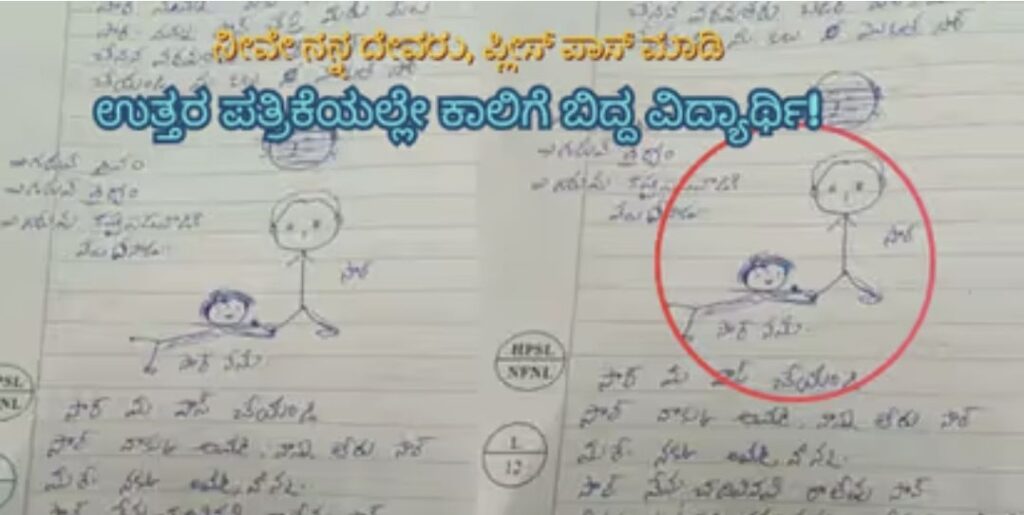“ಸರ್.. ನನಗೆ ಅಪ್ಪ-ಅಮ್ಮ ಇಲ್ಲ ಸರ್. ನೀವೇ ನನಗೆ ಅಪ್ಪ-ಅಮ್ಮ ಇದ್ದಂತೆ. ದಯವಿಟ್ಟು ನನ್ನನ್ನು ಪಾಸ್ ಮಾಡಿ ಸರ್. ನಾನು ಓದಿದ್ದ ಯಾವ ಪ್ರಶ್ನೆಗಳೂ ಪರೀಕ್ಷೆಯಲ್ಲಿ ಬಂದಿಲ್ಲ. ದೇವರು ಇದ್ದಾನೆ ಎಂದು ನಾನು ನಂಬಿದ್ದೇನೆ, ಆ ದೇವರೇ ನೀವೇ ಸರ್. ನಿಮ್ಮ ಕಾಲಿಗೆ ಬೀಳುತ್ತೇನೆ, ನನ್ನನ್ನು ಪಾಸ್ ಮಾಡಿ” ಎಂದು ವಿದ್ಯಾರ್ಥಿ ತನ್ನ ಉತ್ತರ ಪತ್ರಿಕೆಯಲ್ಲಿ ಬರೆದಿದ್ದಾನೆ. ಜೊತೆಗೆ, ಮನವಿ ವ್ಯಕ್ತಪಡಿಸುವಂತೆ ಒಂದು ಚಿತ್ರವನ್ನೂ ಬಿಡಿಸಿದ್ದಾನೆ.