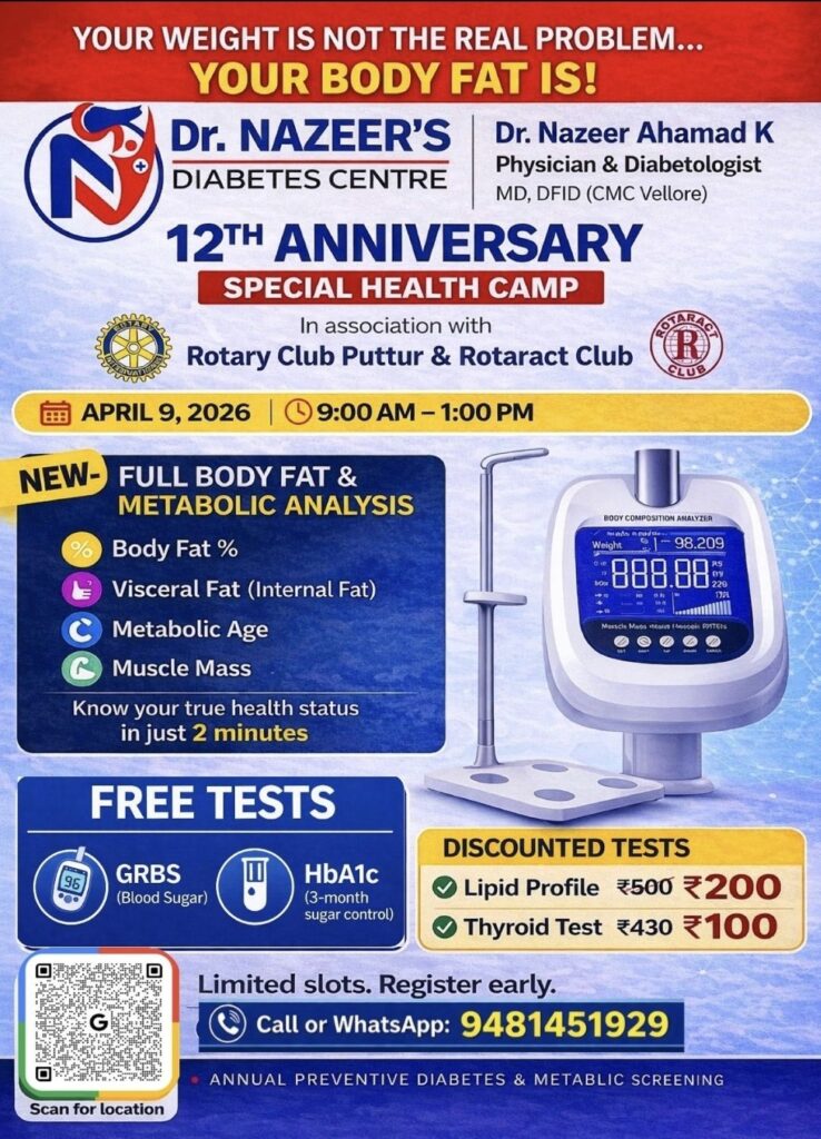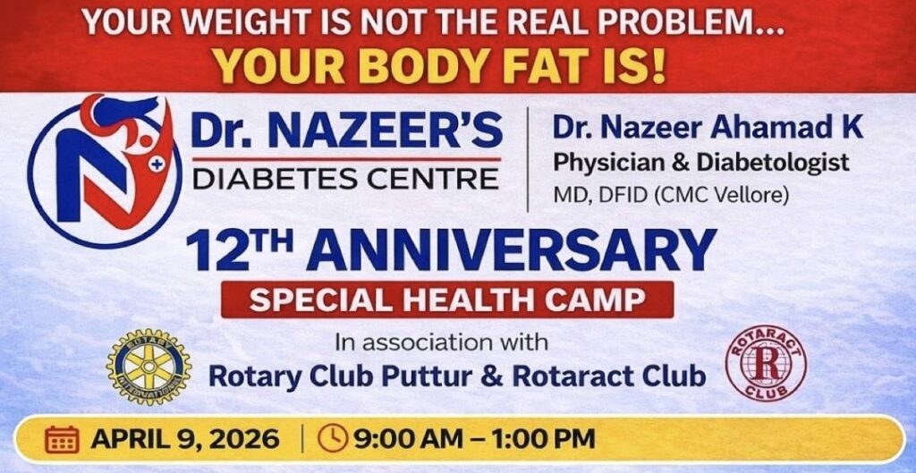 ಪುತ್ತೂರು, ಏ.7: ಡಾ. ನಝೀರ್ ಅಹಮದ್ ಕೆ ಅವರ ನೇತೃತ್ವದ ಡಾ.ನಝೀರ್ಸ್ ಡಯಾಬಿಟೀಸ್ ಸೆಂಟರ್ 13ನೇ ವರ್ಷಕ್ಕೆ ಪಾದಾರ್ಪಣೆ ಮಾಡುತ್ತಿರುವ ಹಿನ್ನೆಲೆಯಲ್ಲಿ ಏಪ್ರಿಲ್ 9ರಂದು ವಿಶೇಷ ಆರೋಗ್ಯ ತಪಾಸಣಾ ಶಿಬಿರ ಆಯೋಜಿಸಲಾಗಿದೆ.