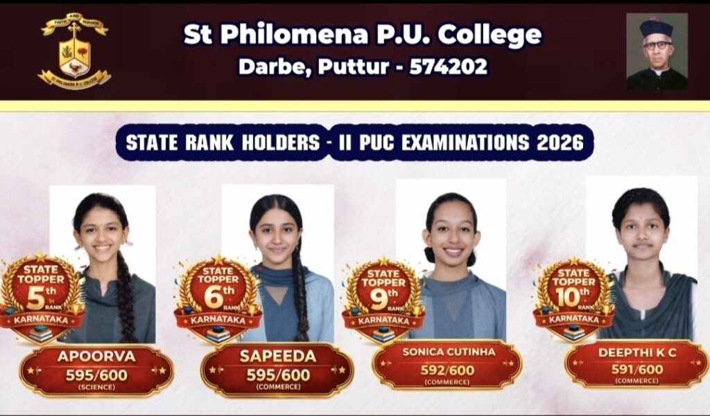 ಪುತ್ತೂರು: 2025–26ನೇ ಸಾಲಿನ ದ್ವಿತೀಯ ಪಿಯುಸಿ ವಾರ್ಷಿಕ ಪರೀಕ್ಷೆಯ ಫಲಿತಾಂಶ ಪ್ರಕಟಗೊಂಡಿದ್ದು, ಪುತ್ತೂರಿನ ಸಂತ ಫಿಲೋಮಿನಾ ಪದವಿ ಪೂರ್ವ ಕಾಲೇಜು ಶೇ. 96ರ ಉತ್ತಮ ಸಾಧನೆ ದಾಖಲಿಸಿದೆ. ವಿಜ್ಞಾನ ಮತ್ತು ವಾಣಿಜ್ಯ ವಿಭಾಗಗಳಲ್ಲಿ ತಲಾ ಮೂರು ರಾಜ್ಯ ರ್ಯಾಂಕ್ಗಳನ್ನು ಪಡೆದು ಕಾಲೇಜು ಗಮನಾರ್ಹ ಸಾಧನೆ ಮಾಡಿದೆ.