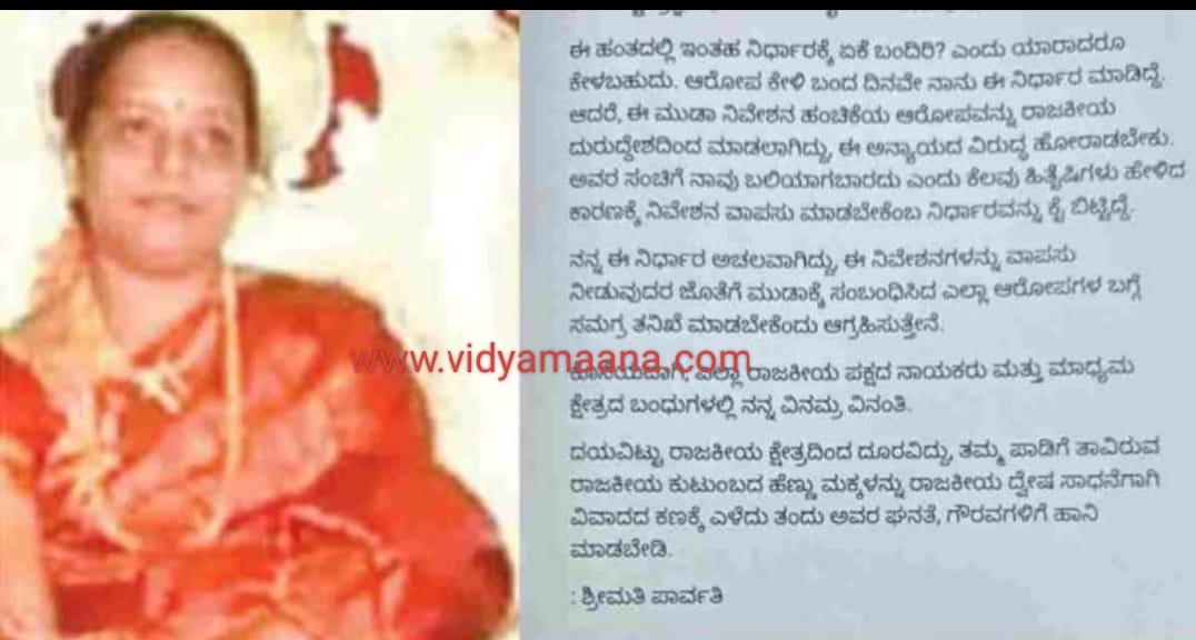 14 ನಿವೇಶನಗಳನ್ನು ಹಿಂದುರಿಗಿಸುತ್ತೇನೆ: ಮೂಡಾ ಆಯುಕ್ತರಿಗೆ ಪತ್ರ ಬರೆದ ಸಿದ್ದರಾಮಯ್ಯರ ಪತ್ನಿ ಪಾರ್ವತಿ