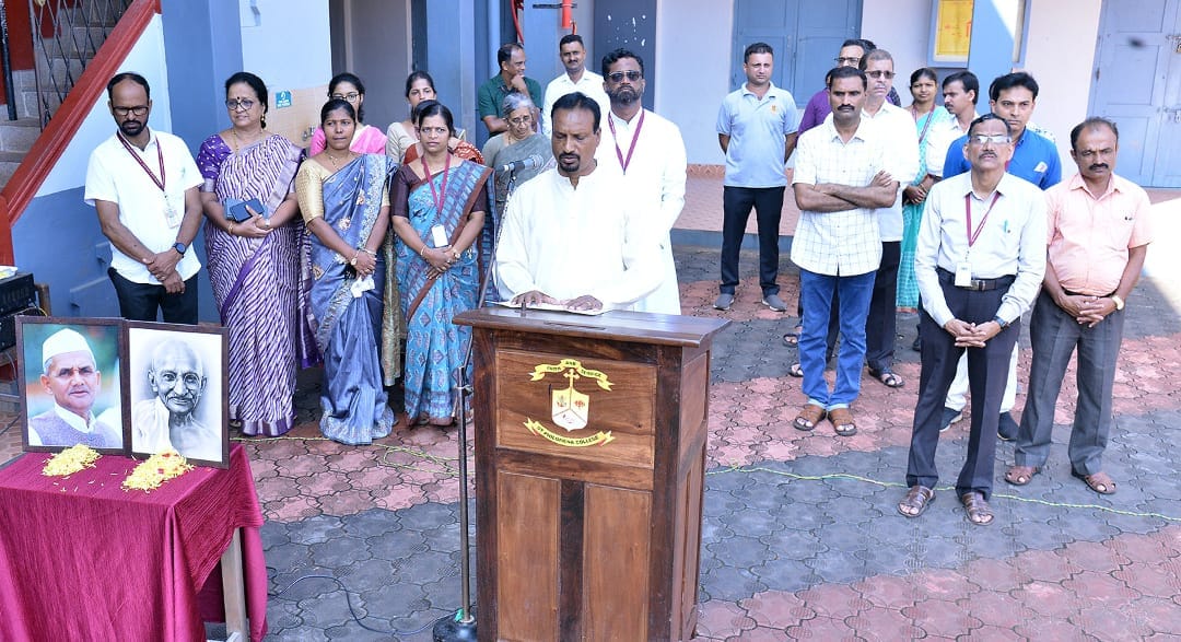 ಕಾರ್ಯಕ್ರಮದ ಮುಖ್ಯ ಅತಿಥಿಯಾಗಿ ಭಾಗವಹಿಸಿದ ಕಾಲೇಜಿನ ರೆಜಿಸ್ಟ್ರಾರ್(ಅಕಾಡೆಮಿಕ್) ಹಾಗೂ ಇತಿಹಾಸ ವಿಭಾಗದ ಮುಖ್ಯಸ್ಥರಾದ ಡಾ| ನಾರ್ಬರ್ಟ್ ಮಸ್ಕರೇನಸ್ರವರು ಗಾಂಧೀ ಸ್ಮೃತಿ ನಡೆಸಿಕೊಟ್ಟರು. ಅವರು “ಈ ದಿನವು ಗಾಧೀಜಿಯವರು ತಮ್ಮ ಜೀವನದುದ್ದಕ್ಕೂ ಅನುಸರಿಸಿದ ಮೌಲ್ಯಗಳ ಬಗ್ಗೆ ಅವಲೋಕನ ಮಾಡುವ ದಿನ. ಅವರು ಸ್ವಾವಲಂಬನೆ ಮತ್ತು ಸರಳತೆಯ ಜೀವನ ಶ್ಯಲಿಯನ್ನು ಬಲವಾಗಿ ನಂಬಿದ್ದರು ಅಂತೆಯೇ ನಡೆದುಕೊಂಡರು. ಅವರ ದೂರದೃಷ್ಟಿ, ಪರಿಸರದ ಬಗೆಗಿನ ಕಾಳಜಿ, ಸ್ಥಳೀಯ ಆರ್ಥಿಕತೆಯನ್ನು ಉತ್ತೇಜಿಸುವ ನೀತಿ ಮುಂತಾದ ವಿಷಯಗಳು ಇಂದಿಗೂ ಪ್ರಸ್ತುತ. ಗಾಂಧೀಜಿಯವರನ್ನು ಗೌರವಿಸುವ ಅತ್ಯುತ್ತಮ ಮಾರ್ಗವೆಂದರೆ ಅವರ ಮೌಲ್ಯಗಳನ್ನು ನಮ್ಮ ಕಾರ್ಯಗಳಲ್ಲಿ ಅಳವಡಿಸಿಕೊಳ್ಳುವುದು “ ಎಂದು ಹೇಳಿದರು.
