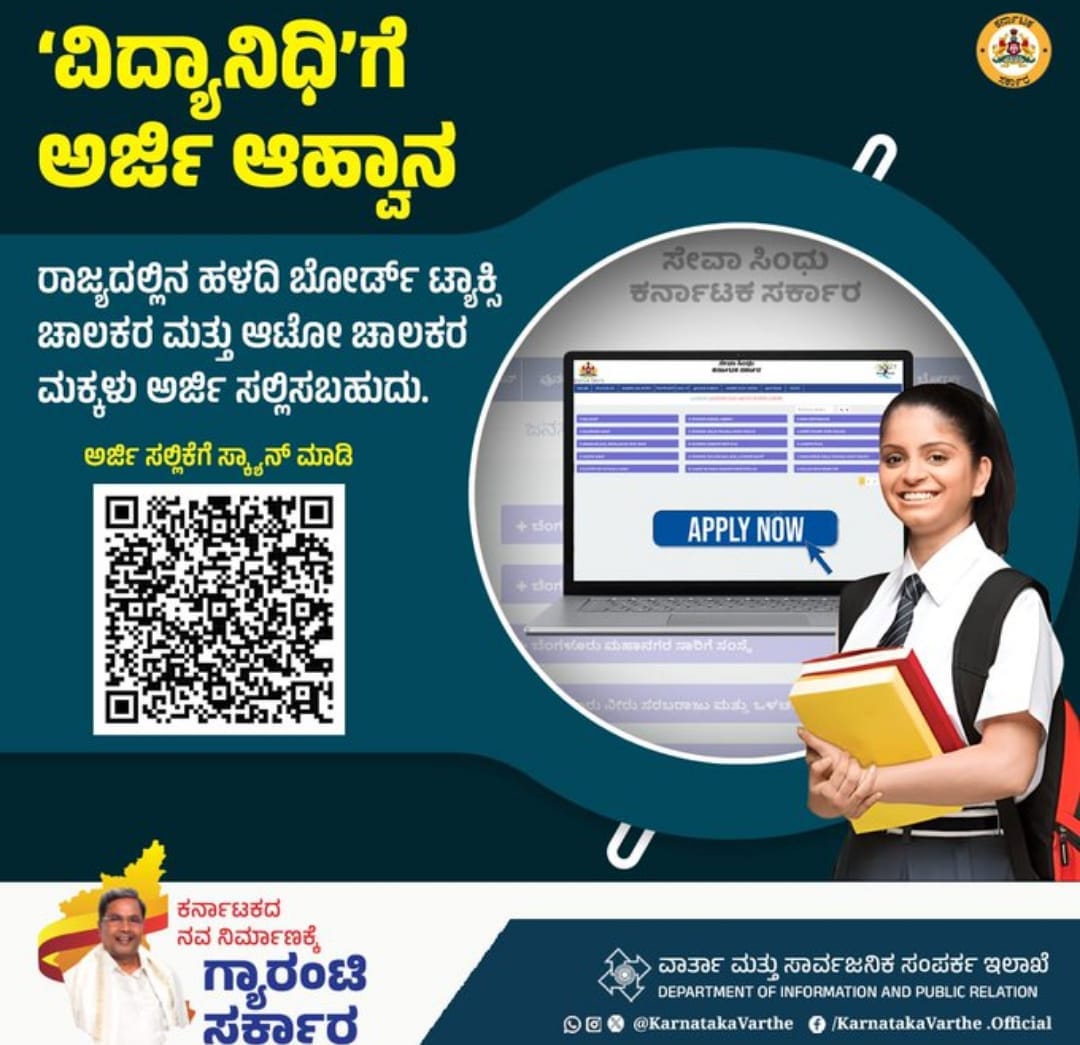 ಬೆಂಗಳೂರು : ರಾಜ್ಯದಲ್ಲಿನ ಯೆಲ್ಲೋ ಬೋರ್ಡ್ ಟ್ಯಾಕ್ಸಿ ಚಾಲಕರ ಮತ್ತು ಆಟೋರಿಕ್ಷಾ ಚಾಲಕರ ಮಕ್ಕಳ ಮೆಟ್ರಿಕ್ ನಂತರದ ಉನ್ನತ ವಿದ್ಯಾಭ್ಯಾಸಕ್ಕಾಗಿ ವಿದ್ಯಾನಿಧಿ ಯೋಜನೆಗೆ ಅರ್ಜಿ ಆಹ್ವಾನಿಸಲಾಗಿದೆ.