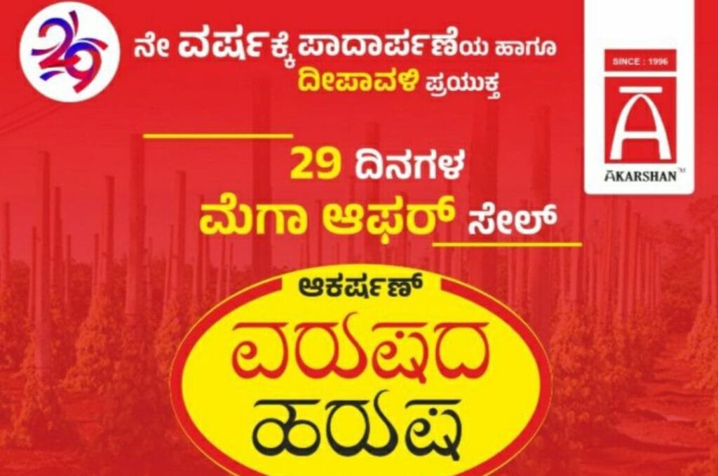 ಕಾಂಕ್ರೀಟ್ ಉತ್ಪನ್ನಗಳ ಉತ್ಪಾದನಾ ಸಂಸ್ಥೆಯಾಗಿರುವ ಪುತ್ತೂರಿನ ಆಕರ್ಷಣ್ ಇಂಡಸ್ಟ್ರೀಸ್ 29 ನೇ ವರ್ಷಕ್ಕೆ ಪಾದಾರ್ಪಣೆಯ ಪ್ರಯುಕ್ತ ಹಾಗೂ ದೀಪಾವಳಿ ಹಬ್ಬದ ಅಂಗವಾಗಿ ಸಂಸ್ಥೆಯಲ್ಲಿ ಮೆಗಾ ಆಫರ್ ಸೇಲ್ ಆಯೋಜಿಸಲಾಗಿದೆ.