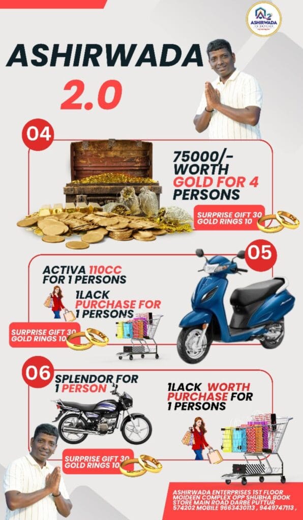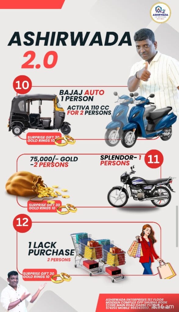 ಪುತ್ತೂರು: ‘ನಿಮ್ಮ ಕನಸು ನಮ್ಮಲ್ಲಿ ನನಸು’ ಎಂಬ ಧ್ಯೇಯವಾಕ್ಯದೊಂದಿಗೆ ಪ್ರಾರಂಭಗೊಂಡಿರುವ ಆಶೀರ್ವಾದ ಎಂಟರ್ ಪ್ರೈಸಸ್ ಇದೀಗ ನಿಮ್ಮ ಸ್ವಾವಲಂಬಿ ಬದುಕಿನ ಕನಸನ್ನು ನನಸು ಮಾಡಲು ಮುಂದಾಗಿದೆ. ತನ್ನ ಪ್ರಥಮ ಸ್ಕೀಂನ ಲಕ್ಕಿ ಡ್ರಾದಲ್ಲಿ ಇಬ್ಬರಿಗೆ ಎರಡು ಬೈಕ್ ಮತ್ತು ಇನ್ನಿಬ್ಬರು ಅದೃಷ್ಟಶಾಲಿಗಳಿಗೆ ಚಿನ್ನ ಗೆಲ್ಲುವ ಅವಕಾಶವನ್ನು ನೀಡಿದ್ದ ಆಶೀರ್ವಾದ್ ಸಂಸ್ಥೆ ಇದೀಗ ಆಶೀರ್ವಾದ 2.0 ಯೋಜನೆಯ ಮೂರನೇ ಲಕ್ಕಿ ಡ್ರಾದಲ್ಲಿ ಒಬ್ಬ ಅದೃಷ್ಟಶಾಲಿಗೆ ಬಜಾಜ್ ಆಟೋ ರಿಕ್ಷಾ ಗೆಲ್ಲುವ ಅವಕಾಶವನ್ನು ನೀಡುತ್ತಿದೆ. ಇದಕ್ಕೆ ನೀವು ಮಾಡಬೇಕಾಗಿರುವುದಿಷ್ಟೇ.. ಆಶೀರ್ವಾದದ ಈ ವಾಟ್ಸ್ಯಾಪ್ ಗ್ರೂಪನ್ನು ಜಾಯಿನ್ ಆಗಿ ಮತ್ತು ನಿಮ್ಮ ಅದೃಷ್ಟದ ಬಾಗಿಲನ್ನು ತೆರೆಯುವ ಮೂಲಕ ನಿವೇಶನದ ಆಶೀರ್ವಾದವನ್ನು ಪಡೆಯಿರಿ..!