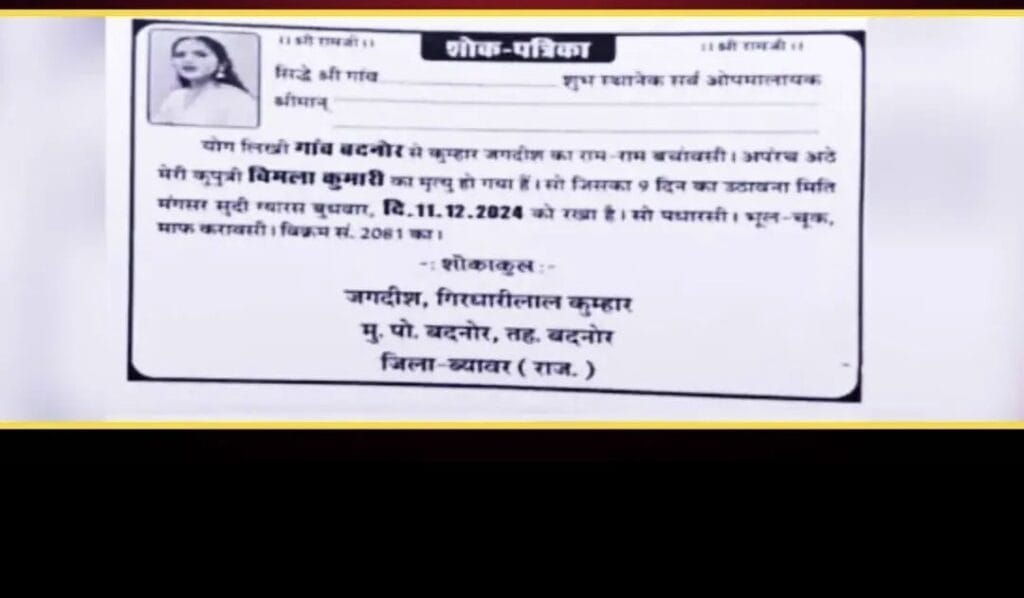 ಹೌದು.. ಪೋಷಕರ ಮಾತನ್ನು ಧಿಕ್ಕರಿಸಿ ತನ್ನ ಪ್ರೇಮಿಯನ್ನೇ ಮದುವೆಯಾದ ಮಗಳ ನಿರ್ಧಾರದಿಂದ ಬೇಸತ್ತ ತಂದೆಯೊಬ್ಬರು ಆಕೆಯ ಮದುವೆ ಹಾಲ್ನಲ್ಲೇ ತಿಥಿ ಕಾರ್ಡ್ ಹಂಚಿದ ಅಪರೂಪದ ಘಟನೆಯೊಂದು ನಡೆದಿದೆ. ರಾಜಸ್ಥಾನದ ಬೇವಾರ್ನಲ್ಲಿ ನೆಲೆಸಿರುವ ತಂದೆಯೊಬ್ಬರು ತಮ್ಮ ಮಗಳ ಹೆಸರಿನಲ್ಲಿ ಇಂಥದ್ದೊಂದು ಕಾರ್ಡ್ ಮುದ್ರಿಸಿದ್ದು ಎಲ್ಲರಲ್ಲೂ ಅಚ್ಚರಿ ಮೂಡಿಸಿದೆ.