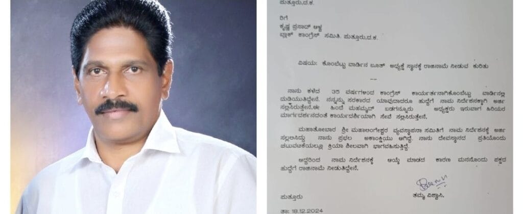 ಮಹತೋಭಾರ ಮಹಾಲಿಂಗೇಶ್ವರ ದೇವಸ್ಥಾನದ ವ್ಯವಸ್ಥಾಪನಾ ಸಮಿತಿಗೆ ನಾಮ ನಿರ್ದೇಶನಕ್ಕೆ ಅರ್ಜಿ ಸಲ್ಲಿಸಿದ್ದು ಪ್ರಬಲ ಆಕಾಂಕ್ಷಿಯಾಗಿದ್ದೆ ದೇವಸ್ಥಾನದ ಪ್ರತಿಯೊಂದು ಚಟುವಟಿಕೆಗಳಲ್ಲೂ ಸಕ್ರಿಯವಾಗಿ ಭಾಗವಹಿಸುತ್ತಿದ್ದೆ ಅದರೂ ನನ್ನನ್ನು ಆಯ್ಕೆ ಮಾಡದ ಕಾರಣ ಮನನೊಂದು ಪಕ್ಷದ ಹುದ್ದೆಗೆ ರಾಜೀನಾಮೆ ನೀಡುತ್ತಿದ್ದೇನೆ ಎಂದು ಪತ್ರದಲ್ಲಿ ತಿಳಿಸಿದ್ದಾರೆ.