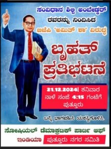 ಪುತ್ತೂರು: ಸಂಸತ್ತಿನಲ್ಲಿ ತಮ್ಮ ಭಾಷಣದಲ್ಲಿ ಕೇಂದ್ರ ಗೃಹ ಸಚಿವ ಅಮಿತ್ ಶಾ ಅವರು ಸಂವಿಧಾನ ಶಿಲ್ಪಿ ಡಾ. ಬಿ. ಆರ್. ಅಂಬೇಡ್ಕರ್ ಅವರಿಗೆ ಅವಮಾನವಾಗುವ ರೀತಿಯಲ್ಲಿ ಮಾತನಾಡಿದ್ದಾರೆ ಎಂದು ಆರೋಪಿಸಿ ದೇಶಾದ್ಯಂತ ಪ್ರತಿಭಟನೆಗಳು ನಡೆಯುತ್ತಿವೆ.