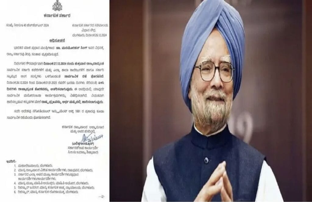ಭಾರತದ ಮಾಜಿ ಪ್ರಧಾನಿ, ಪ್ರಸಿದ್ಧ ಅರ್ಥಶಾಸ್ತ್ರಜ್ಞ, ಹಿರಿಯ ಕಾಂಗ್ರೆಸ್ಸಿಗ ಮನಮೋಹನ್ ಸಿಂಗ್ ಅವರ ನಿಧನದ ಹಿನ್ನೆಲೆಯಲ್ಲಿ ಕರ್ನಾಟಕ ರಾಜ್ಯ ಸರ್ಕಾರ ಏಳು ದಿನಗಳ ಶೋಕಾಚರಣೆಯನ್ನು ಘೋಷಿಸಿದೆ. ಅಲ್ಲದೆ, ಇಂದು (ಡಿಸೆಂಬರ್ 27ರಂದು) ರಜೆ ಘೋಷಿಸಿದೆ