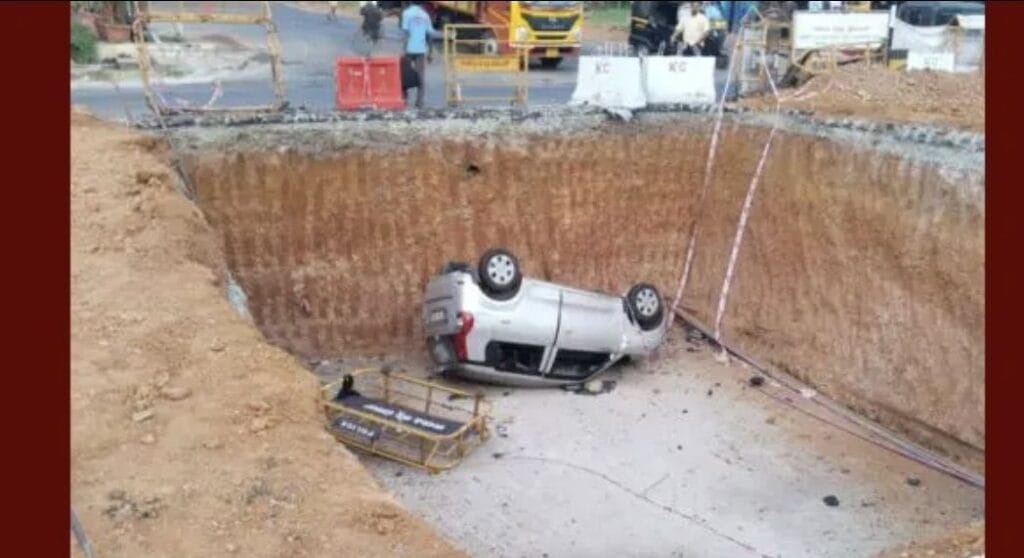 ಅಂಬಲಪಾಡಿಯಲ್ಲಿ ಮೇಲ್ಸೇತುವೆ ನಿರ್ಮಾಣಕ್ಕಾಗಿ ತೆಗೆಯಲಾಗಿದ್ದ ಬೃಹತ್ ಗುಂಡಿಗೆ ಕಾರೊಂದು ಬಿದ್ದಿದೆ.