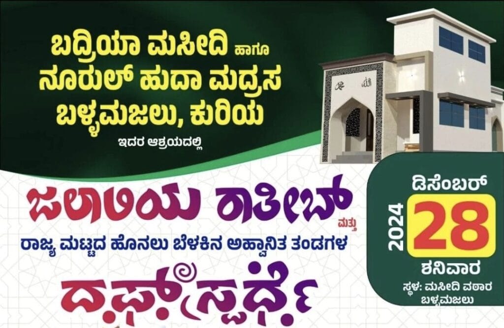 ಪುತ್ತೂರು: ಬದ್ರಿಯಾ ಮಸೀದಿ ಹಾಗೂ ನೂರುಲ್ ಹುದಾ ಮದ್ರಸ ಬಳ್ಳಮಜಲು ಕುರಿಯ ಇದರ ಆಶ್ರಯದಲ್ಲಿ ಜಲಾಲಿಯಾ ರಾತೀಬ್ ಮತ್ತು ರಾಜ್ಯ ಮಟ್ಟದ ಹೊನಲು ಬೆಳಕಿನ ಆಹ್ವಾನಿತ ತಂಡಗಳ ದಫ್ ಸ್ಪರ್ಧೆ ಇಂದು ರಾತ್ರಿ ಮಗ್ರಿಬ್ ನಮಾಜಿನ ಬಳಿಕ ನಡೆಯಲಿದೆ. ಬಳ್ಳಮಜಲು ಕುರಿಯ ಬದ್ರಿಯಾ ಮಸೀದಿಯ ಗೌರವಾಧ್ಯಕ್ಷರಾದ ಅಸ್ಸಯ್ಯದ್ ಯಹ್ಯಾ ತಂಬಳ್ ಪೋಳ್ಯ ದುವಾ ನೆರವೇರಿಸಲಿದ್ದು ಸ್ಥಳೀಯ ಅಧ್ಯಾಪಕರಾದ ಅಬ್ಬಾಸ್ ಮುಸ್ಲಿಯಾರ್ ಕಟ್ಟತ್ತಡ ಉದ್ಘಾಟಿಸಲಿದ್ದಾರೆ. ಬಳ್ಳಮಜಲು ಕುರಿಯ ಬದ್ರಿಯಾ ಮಸೀದಿಯ ಅಧ್ಯಕ್ಷ ರಫೀಕ್ ಕುರಿಯ ಅಧ್ಯಕ್ಷತೆ ವಹಿಸಲಿದ್ದು ಕೂರ್ನಡ್ಕ ಜುಮಾಮಸೀದಿ ಮುದಗ್ರಿಸ್ ಉನೈಸ್ ಫೈಝಿ ವಳವೂರ್ ಪ್ರಾಸ್ತಾವಿಕ ಭಾಷಣ ನಡೆಸಲಿದ್ದಾರೆ. ಹಲವಾರು ಗಣ್ಯರು ಅತಿಥಿಗಳಾಗಿ ಭಾಗವಹಿಸಲಿದ್ದಾರೆ. ಮಗ್ರಿಬ್ ನಮಾಜಿನ ಬಳಿಕ ಅಸ್ಸಯ್ಯದ್ ಯಹ್ಯಾ ತಂಬಳ್ ಪೋಳ್ಯರವರ ನೇತೃತ್ವದಲ್ಲಿ ಜಲಾಲಿಯಾ ರಾತೀಬ್ ನಡೆಯಲಿದೆ. ದಫ್ ಸ್ಪರ್ಧೆಯಲ್ಲಿ ವಿಜೇತ ತಂಡಗಳಿಗೆ ಪ್ರಥಮ ನಗದು ರೂ.20001 ಮತ್ತು ಟ್ರೋಫಿ, ದ್ವಿತೀಯ ರೂ.15001 ಮತ್ತು ಟ್ರೋಫಿ, ತೃತೀಯ ರೂ.10001 ಮತ್ತು ಟ್ರೋಫಿ ನೀಡಲಾಗುತ್ತದೆ. ಅಲ್ಲದೇಭಾಗವಹಿಸಿದ ಎಲ್ಲ ತಂಡಗಳಿಗೂ ಪ್ರೋತ್ಸಾಹಕ ಬಹುಮಾನ ನೀಡಲಾಗುತ್ತದೆ ಎಂದು ಸಂಘಟಕರು ತಿಳಿಸಿದ್ದಾರೆ.