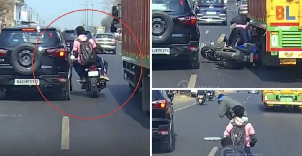ಭಾ ರತೀಯ ರಸ್ತೆಗಳಲ್ಲಿನ ಅಪಾಯಕಾರಿ ಚಾಲನೆಗೆ ಸಾಕ್ಷಿಯಾದ ವಿಡಿಯೋವೊಂದು ಸಾಮಾಜಿಕ ಜಾಲತಾಣದಲ್ಲಿ ವೈರಲ್ ಆಗಿದೆ. ಈ ವಿಡಿಯೋದಲ್ಲಿ, ಮೂವರು ವ್ಯಕ್ತಿಗಳು ಒಂದೇ ಬೈಕ್ನಲ್ಲಿ ಅತಿವೇಗವಾಗಿ ಚಲಿಸುತ್ತಾ ಟ್ರಕ್ನಡಿ ಸಿಲುಕುವ ಅಪಾಯದಿಂದ ಸ್ವಲ್ಪದರಲ್ಲಿ ಪಾರಾಗಿದ್ದಾರೆ.