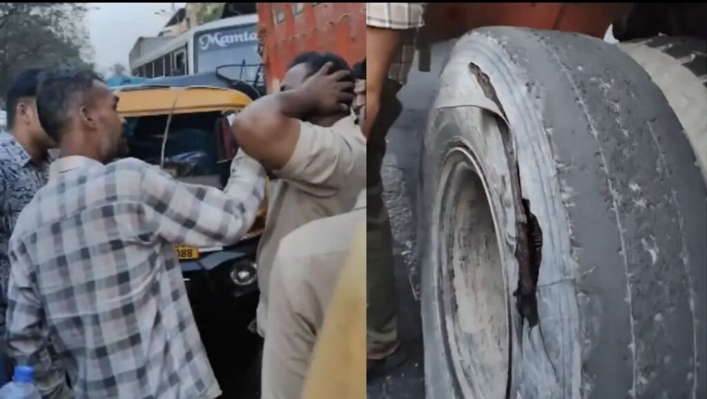 ಆತನ ಸುತ್ತಲೂ ಹಲವಾರು ಜನರು ಜಮಾಯಿಸಿದ್ದಾರೆ. ಟ್ರಕ್ನ ಸಿಡಿದ ಟೈರ್ ಮತ್ತು ಹಾನಿಗೊಳಗಾದ ರಿಕ್ಷಾವನ್ನು ವಿಡಿಯೋದಲ್ಲಿ ಕಾಣಬಹುದು.