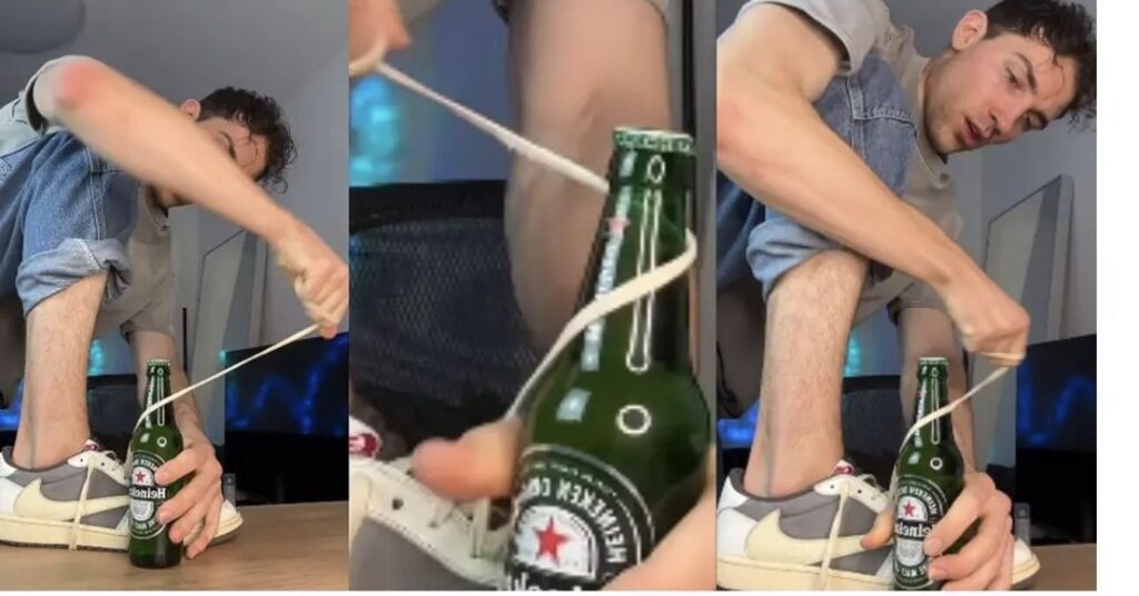 ಹೈನೆಕೆನ್ ಬಿಯರ್ ಬಾಟಲ್ ಅನ್ನು ಟೇಬಲ್ ಮೇಲೆ ಇಟ್ಟು, ಬಾಟಲ್ ಓಪನರ್ ಬಳಸದೆ ಶೂಲೇಸ್ನಿಂದ ಓಪನ್ ಮಾಡಲು ಪ್ರಯತ್ನಿಸಿದರು. ಶೂಲೇಸ್ ಅನ್ನು ಬಾಟಲ್ನ ಕುತ್ತಿಗೆ ಮತ್ತು ಕ್ಯಾಪ್ ಸುತ್ತಲೂ ಸುತ್ತಿ ಟೆನ್ಷನ್ ಕ್ರಿಯೇಟ್ ಮಾಡಿದ್ರು.