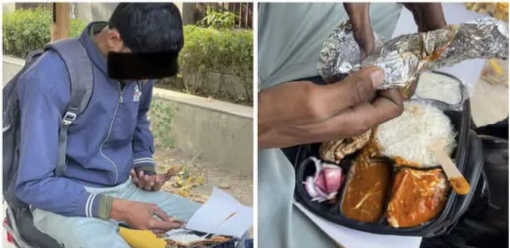 ನೋಯ್ಡಾದಲ್ಲಿ ನಡೆದ ಈ ಘಟನೆಯಲ್ಲಿ, ಕಿರಣ್ ವರ್ಮಾ ಎಂಬ ಸಾಮಾಜಿಕ ಕಾರ್ಯಕರ್ತರು ಝೊಮ್ಯಾಟೊ ರೈಡರ್ ಒಬ್ಬರು ಊಟ ಮಾಡುತ್ತಿರುವುದನ್ನು ಗಮನಿಸಿದ್ದಾರೆ.