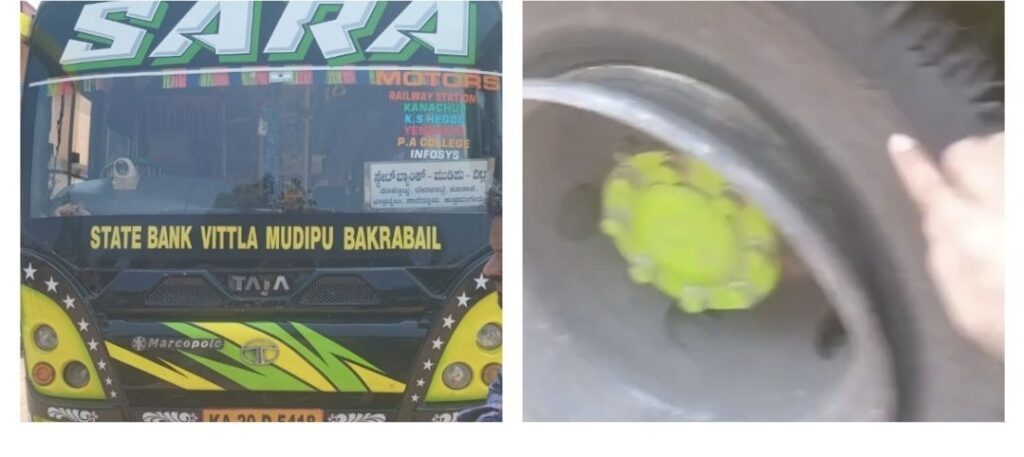ವಿಟ್ಲ-ಮುಡಿಪು-ಮಂಗಳೂರು ಮಧ್ಯೆ ಸಂಚರಿಸುವ ಸಾರಾ ಹೆಸರಿನ ಖಾಸಗಿ ಬಸ್ಸಿನ ಹಿಂದಿನ ಎಡಭಾಗದಲ್ಲಿ ಒಂದೇ ಚಕ್ರದಲ್ಲಿ ಸಂಚರಿಸುತ್ತಿತ್ತು.