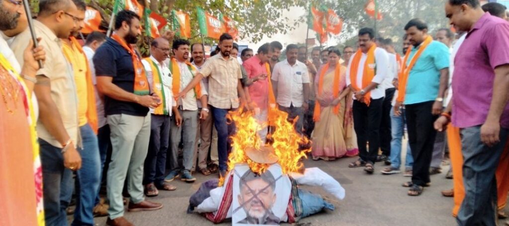 ರಾಜ್ಯದ ಉಪಮುಖ್ಯಮಂತ್ರಿ ಡಿ.ಕೆ.ಶಿವಕುಮಾರ್ ಹೇಳಿಕೆ ವಿಚಾರಕ್ಕೆ ಸಂಬAಧಿಸಿ ಪುತ್ತೂರು ಬಿಜೆಪಿ ಪ್ರತಿಭಟನೆ ಹಮ್ಮಿಕೊಂಡಿತ್ತು. ಈ ಸಂದರ್ಭ ಪ್ರತಿಕೃತಿ ದಹನಕ್ಕೆ ಪ್ರತಿಭಟನಾಕಾರರು ಪ್ರಯತ್ನಿಸಿದ್ದು, ನ್ಯಾಯಾಲಯ ಆದೇಶದಂತೆ ಪ್ರತಿಕೃತಿ ದಹನ ಮಾಡಬಾರದು ಎಂದು ಪೊಲೀಸರು ತಿಳಿಸಿದರು. ಆದರೆ ಡಿ.ಕೆ.ಶಿವಕುಮಾರ್ ಭಾವಚಿತ್ರದ ಪ್ರತಿಕೃತಿ ದಹನಕ್ಕೆ ಪ್ರತಿಭಟನಾಕಾರರು ಮುಂದಾದಾಗ ಪೊಲೀಸರು ತಡೆಯಲು ಯತ್ನಿಸಿದರು. ಈ ಸಂದರ್ಭ ಪೊಲೀಸರು ಮತ್ತು ಪ್ರತಿಭಟನಾಕಾರ ನಡುವೆ ಮಾತಿನ ಚಕಮುಕಿ ಹಾಗೂ ನೂಕಾಟ ತಳ್ಳಾಟ ನಡೆಯಿತು. ಈ ಸಂದರ್ಭದಲ್ಲಿ ಮಧ್ಯಪ್ರವೇಶಿದ ಮಾಜಿ ಶಾಸಕ ಸಂಜೀವ ಮಠಂದೂರು ಹಾಗೂ ಕಾರ್ಯಕರ್ತರು ಪೊಲೀಸರ ವಿರುದ್ಧ ಅಕ್ರೋಶ ವ್ಯಕ್ತಪಡಿಸಿದರು. ಪ್ರತಿಭಟನಾಕಾರರು ಪ್ರತಿಕೃತಿಯನ್ನು ಪೊಲೀಸರ ಕೈಯಿಂದ ಎಳೆದುಕೊಂಡು ರಸ್ತೆ ಮಧ್ಯೆ ಪ್ರತಿಕೃತಿಗೆ ಬೆಂಕಿ ಹಚ್ಚಿ ಘೋಷಣೆಗಳನ್ನು ಕೂಗಿದರು.